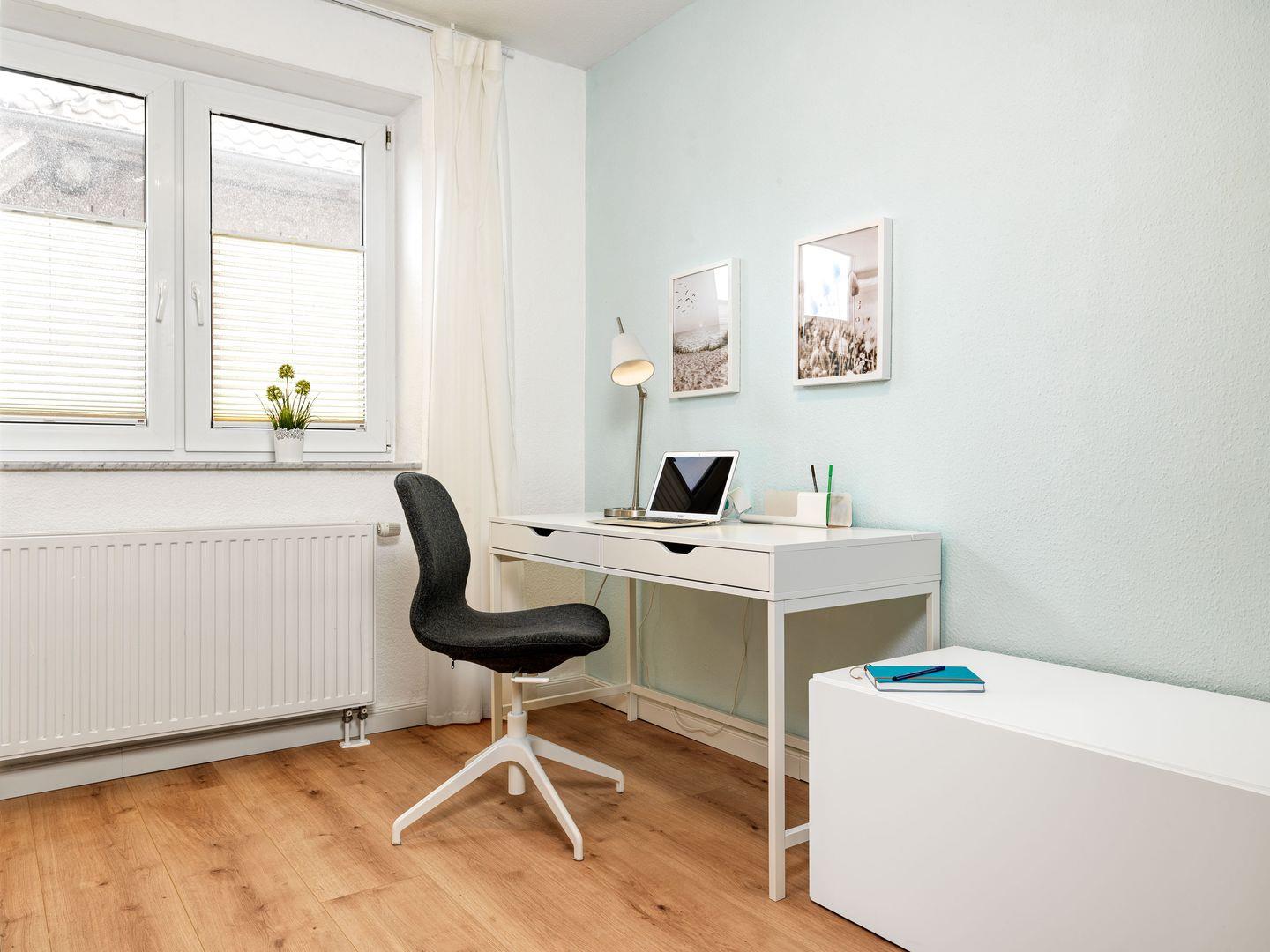 Ein Arbeitsplatz mit einem komfortablen Schreibtisch bietet Ihnen einen ruhigen Ort, um entspannt zu arbeiten oder Ihrer Kreativität freien Lauf zu lassen. Perfekt für eine Workation.