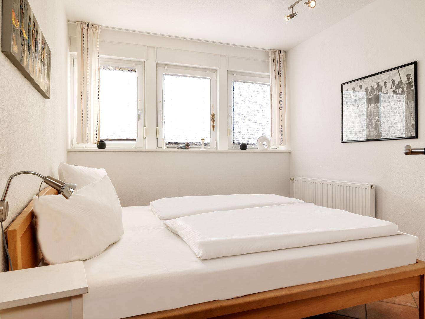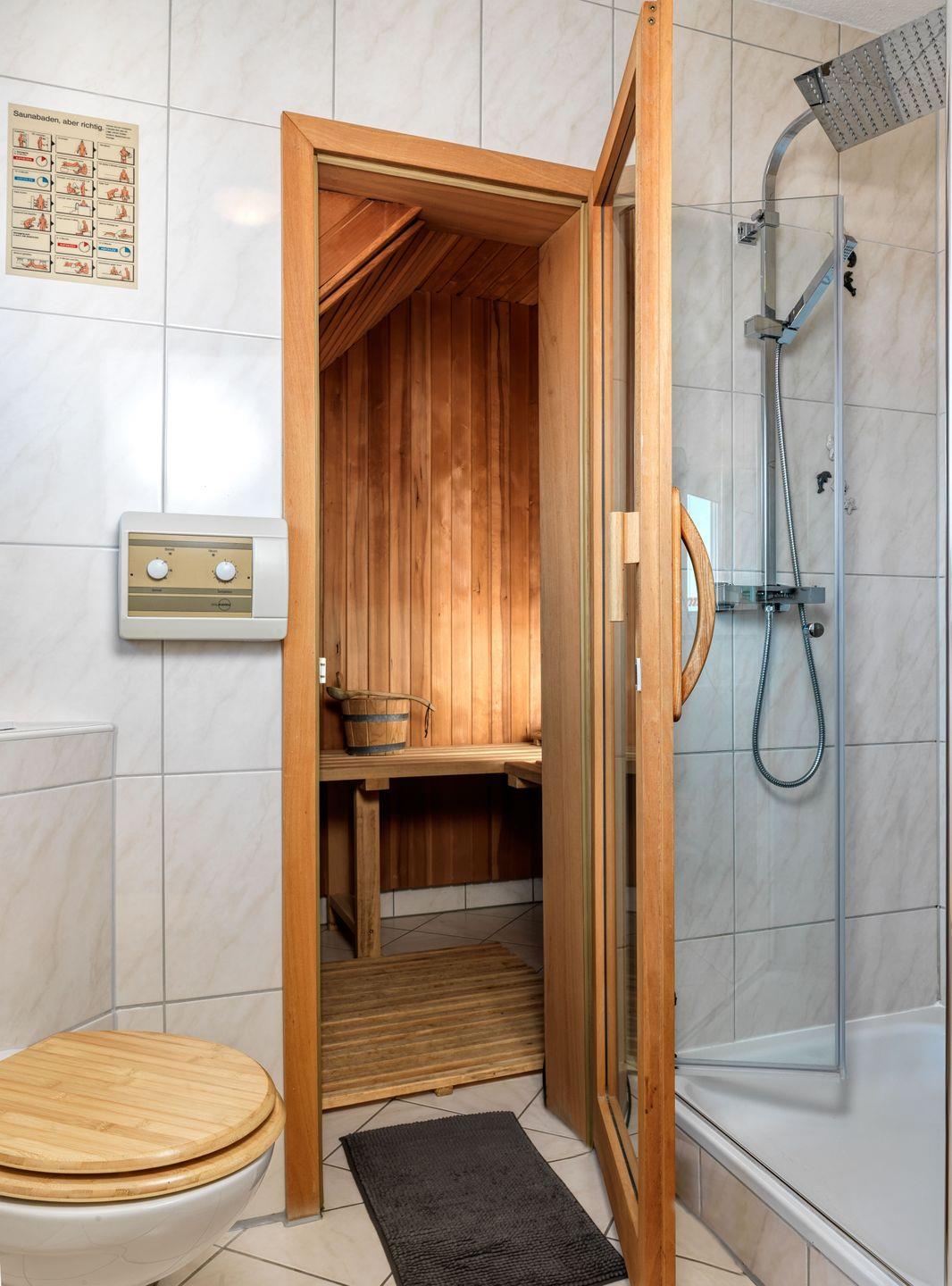 In diesem Feriendoppelhaus erwartet Sie eine gemütliches Wohnzimmer mit Flat-TV, Stereoanlage, Kaminofen, Schlafcouch und offener Einbauküche. Hier finden Sie alles, was man für einen gelungenen Urlaub braucht: Kühl-Gefrierkombination, Herd/Backofen, Geschirrspüler und Mikrowelle. Vom Wohnzimmer aus gelangen Sie auf die große Terrasse mit Terrassenmöbeln, Sonnenschirm und Grill. Ebenfalls befindet sich ein Schlafzimmer mit einem franz. Doppelbett im EG. Ein großes Badezimmer mit Badewanne und WC sowie Waschmaschine rundet das EG ab. Zwei gemütliche Schlafzimmer mit Doppelbetten, eins davon mit eigenem TV-Gerät, stehen für bis zu 4 Personen im OG bereit. Hier befindet sich das große Bad mit Dusche/WC und Sauna.