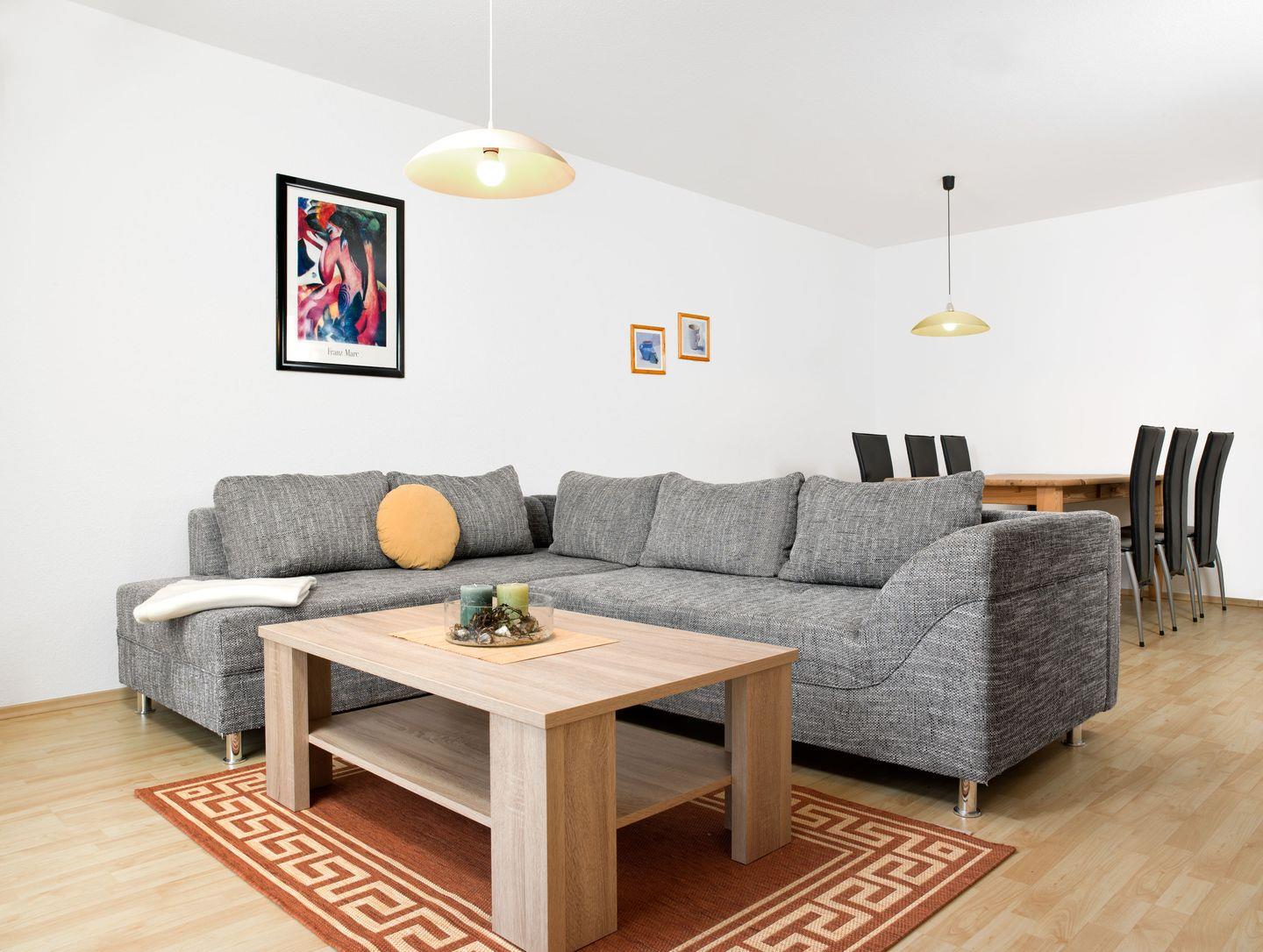 Vom Flur aus gelangen Sie direkt ins helle, gemütliche Wohnzimmer ausgestattet mit gemütlicher Couch, TV mit DVD-Player und einer Essecke für entspannte Familienabende. Von hier aus gelangen Sie auf einen kleinen Balkon, der mit Balkonmöbeln ausgestattet ist.
