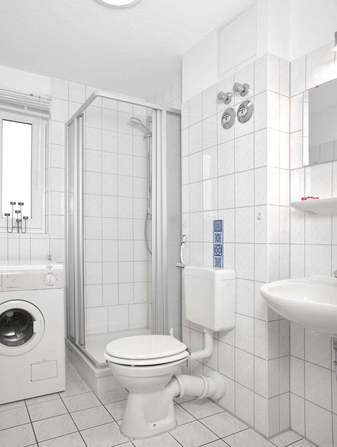 Das Bad ist mit Dusche und WC ausgestattet.