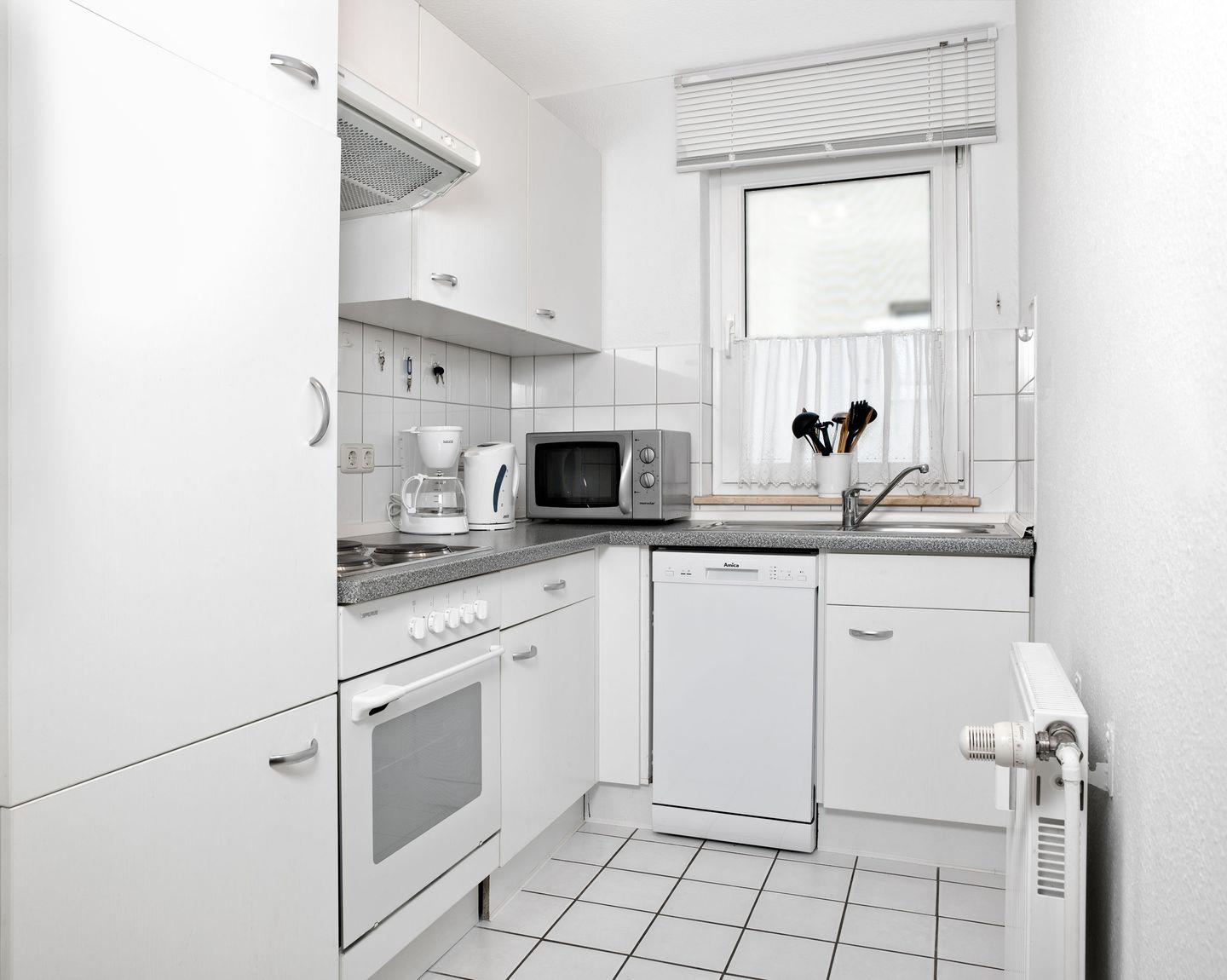 Die Küche verfügt über einen Geschirrspüler, Mikrowelle, Kaffeemaschine und diversen Küchenutensilien.