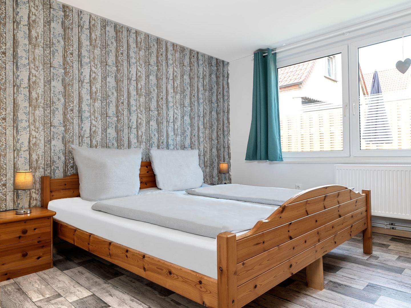 Das Schlafzimmer mit einem Doppelbett (180x200), Kommode, Kleiderschrank und Fliegengittern ist gemütlich eingerichtet.