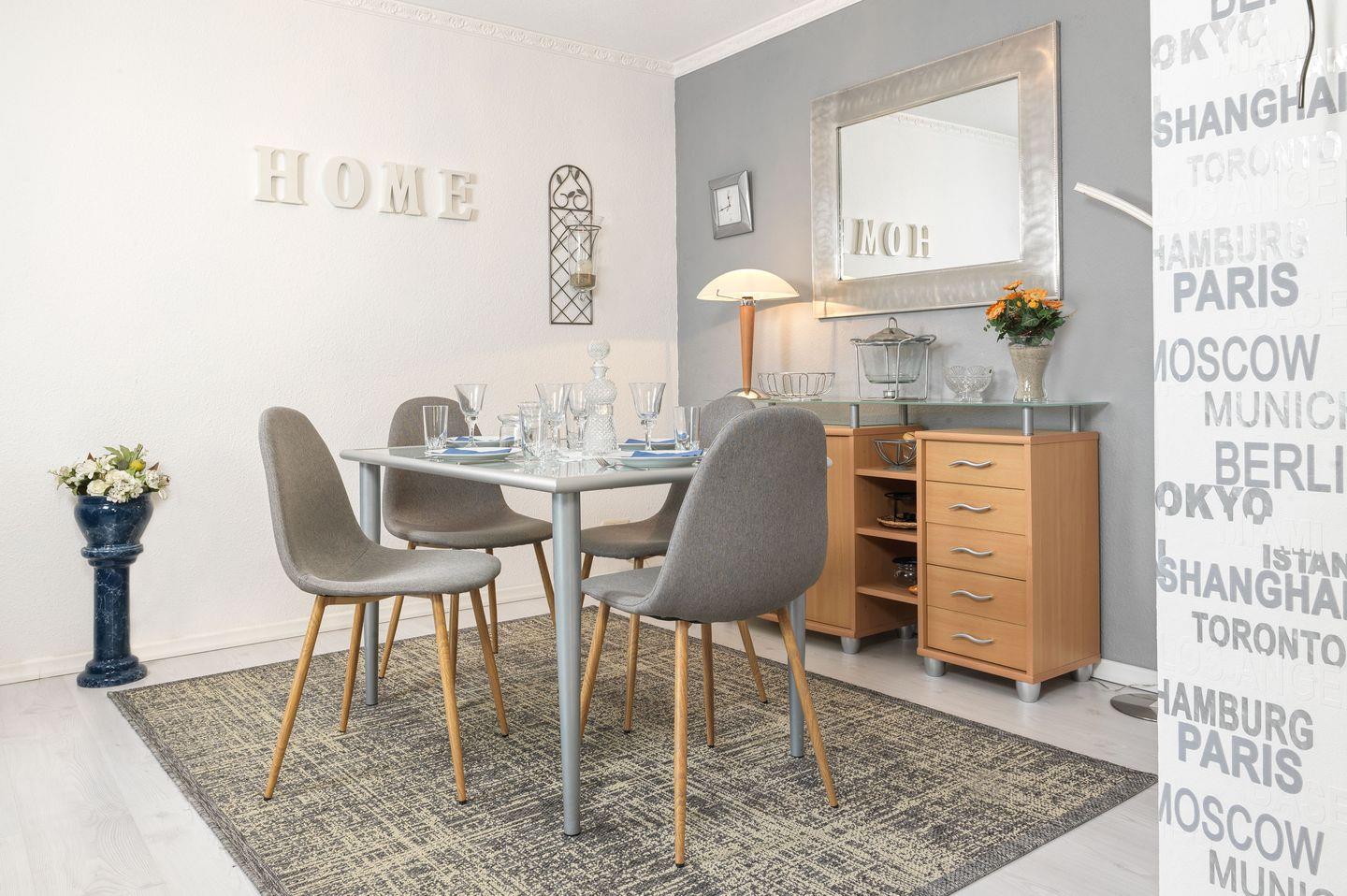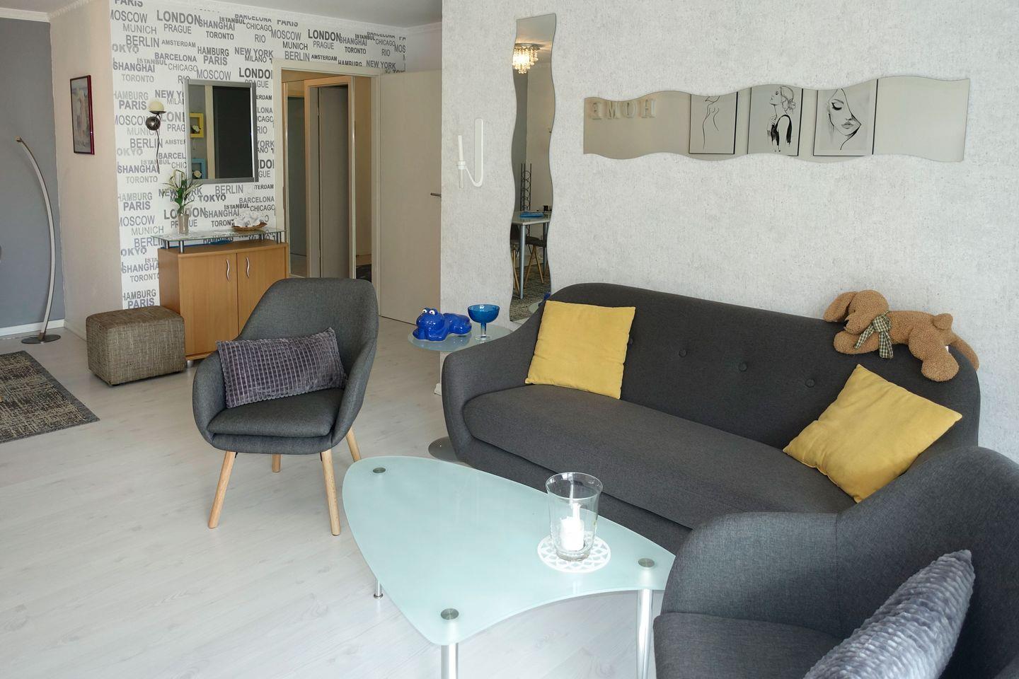 Vom Flur aus gelangen Sie direkt ins helle, gemütliche Wohnzimmer ausgestattet mit gemütlicher Couch, TV mit DVD-Player und einer Essecke für entspannte Familienabende. Von hier aus gelangen Sie auf einen kleinen Balkon, der mit Balkonmöbeln ausgestattet ist.