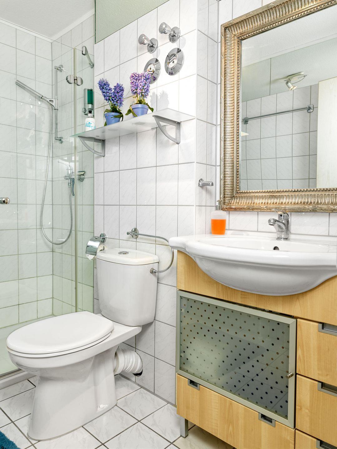 Das Bad ist mit Dusche und WC ausgestattet.