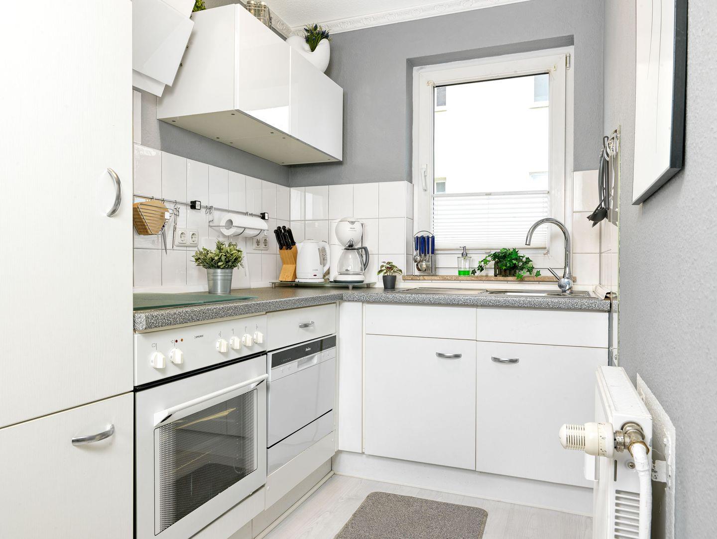 Die Küche verfügt über einen Mini-Geschirrspüler, Mikrowelle, Kaffeemaschine und diversen Küchenutensilien.