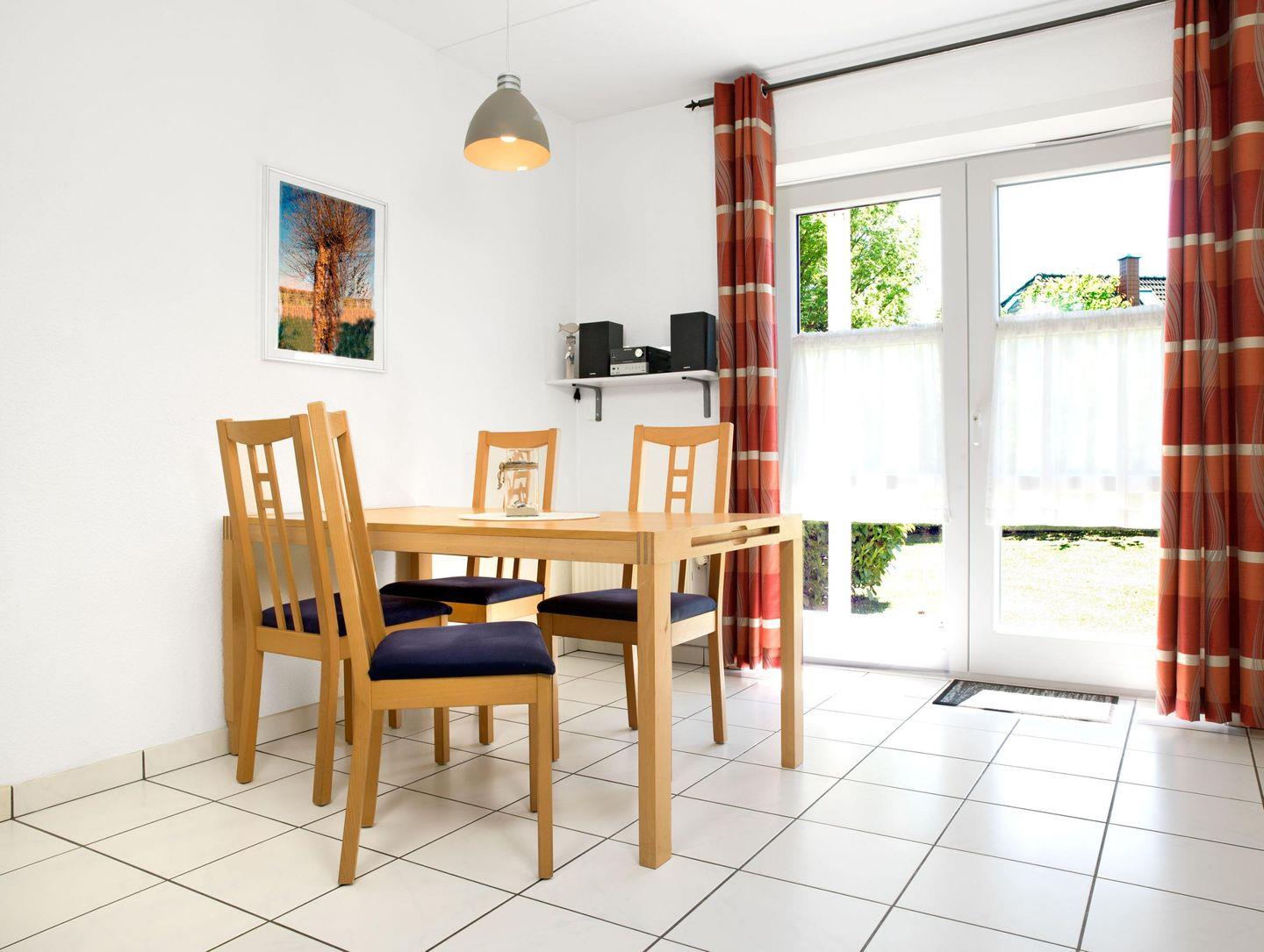 Im Wohnzimmer befindet sich eine Essecke und ein gemütliches Sofa.