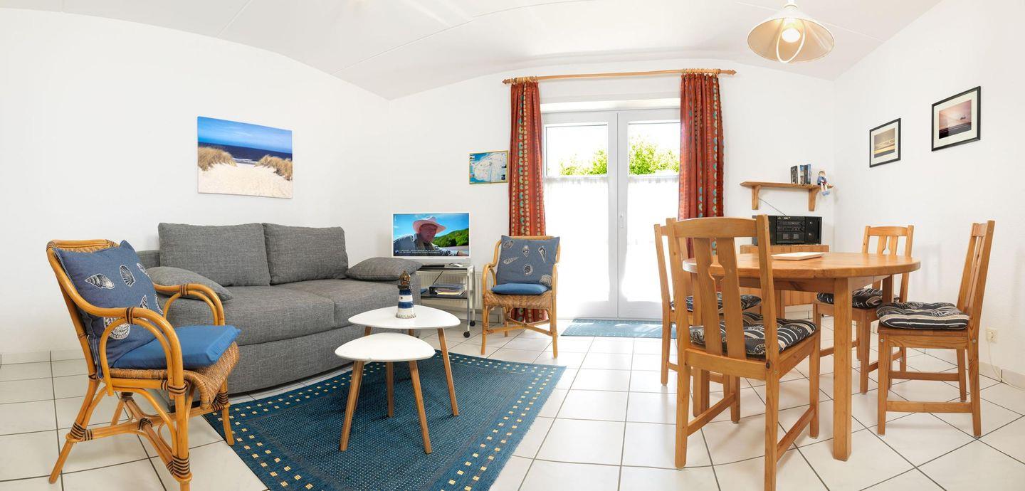 Im Wohnzimmer, befindet sich eine Essecke und ein gemütliches Sofa.
