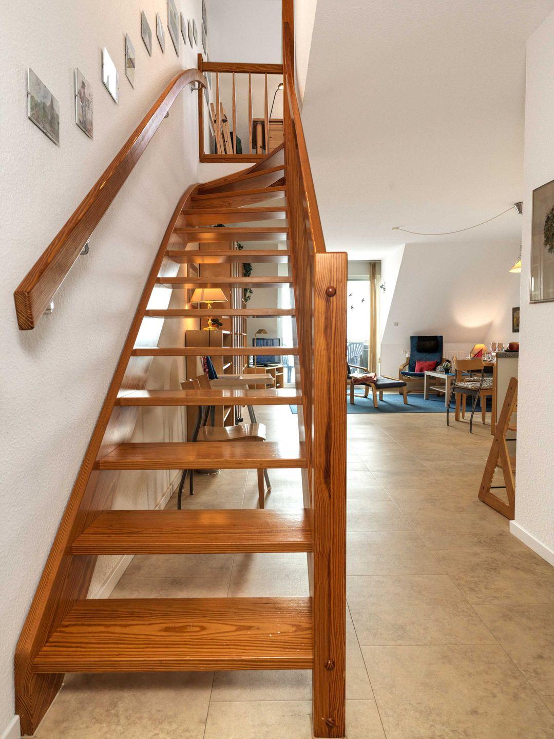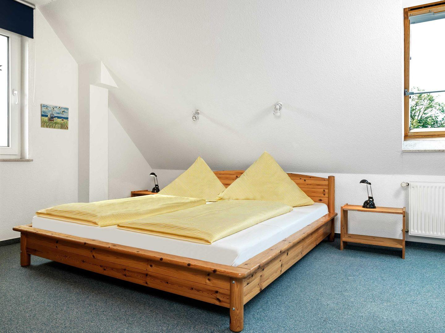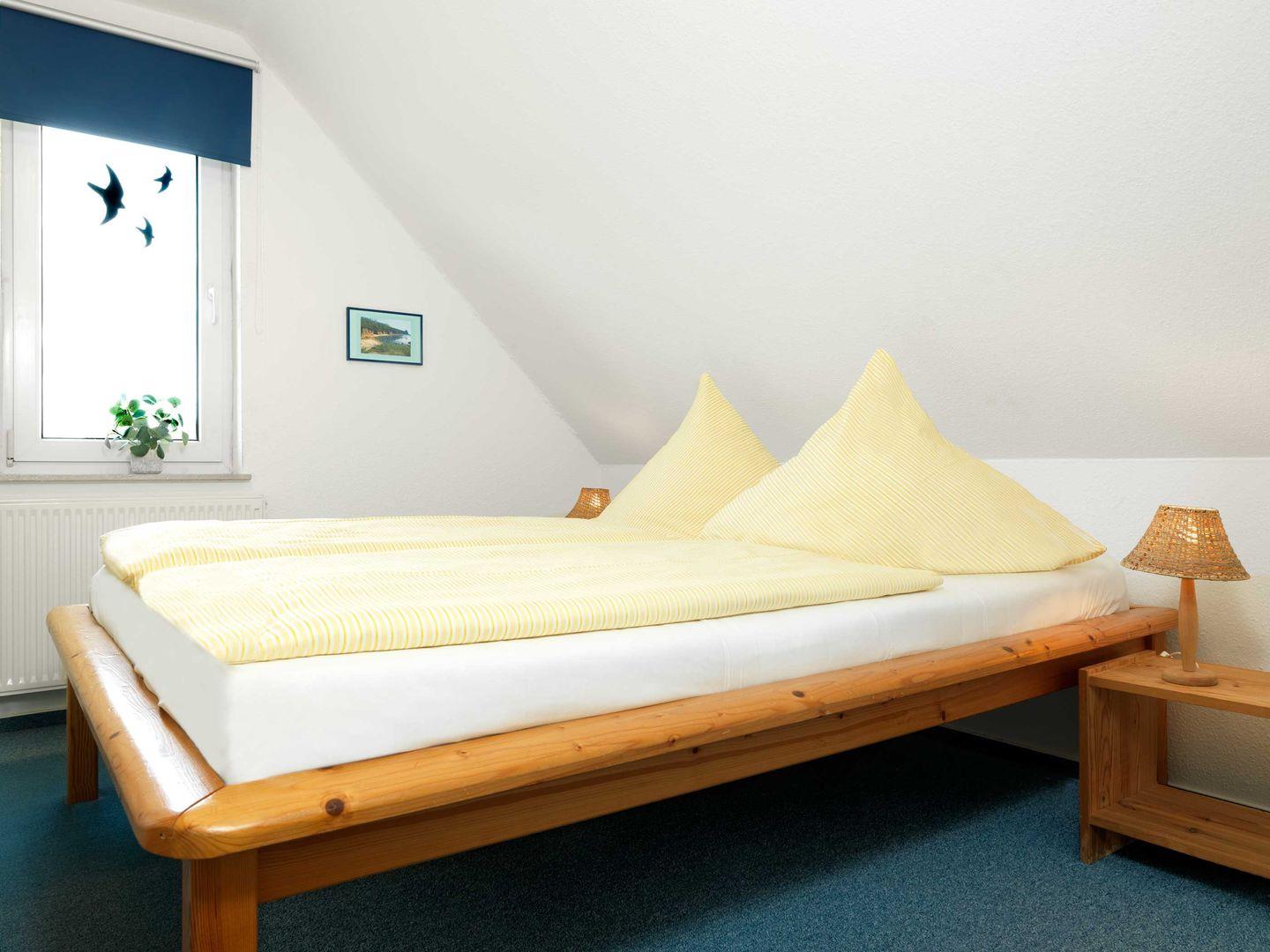 Ein Schlafzimmer mit Doppelbett und weiteres Schlafzimmer mit Doppelbett im Dachgeschoss bieten bis zu 4 Personen Platz.
