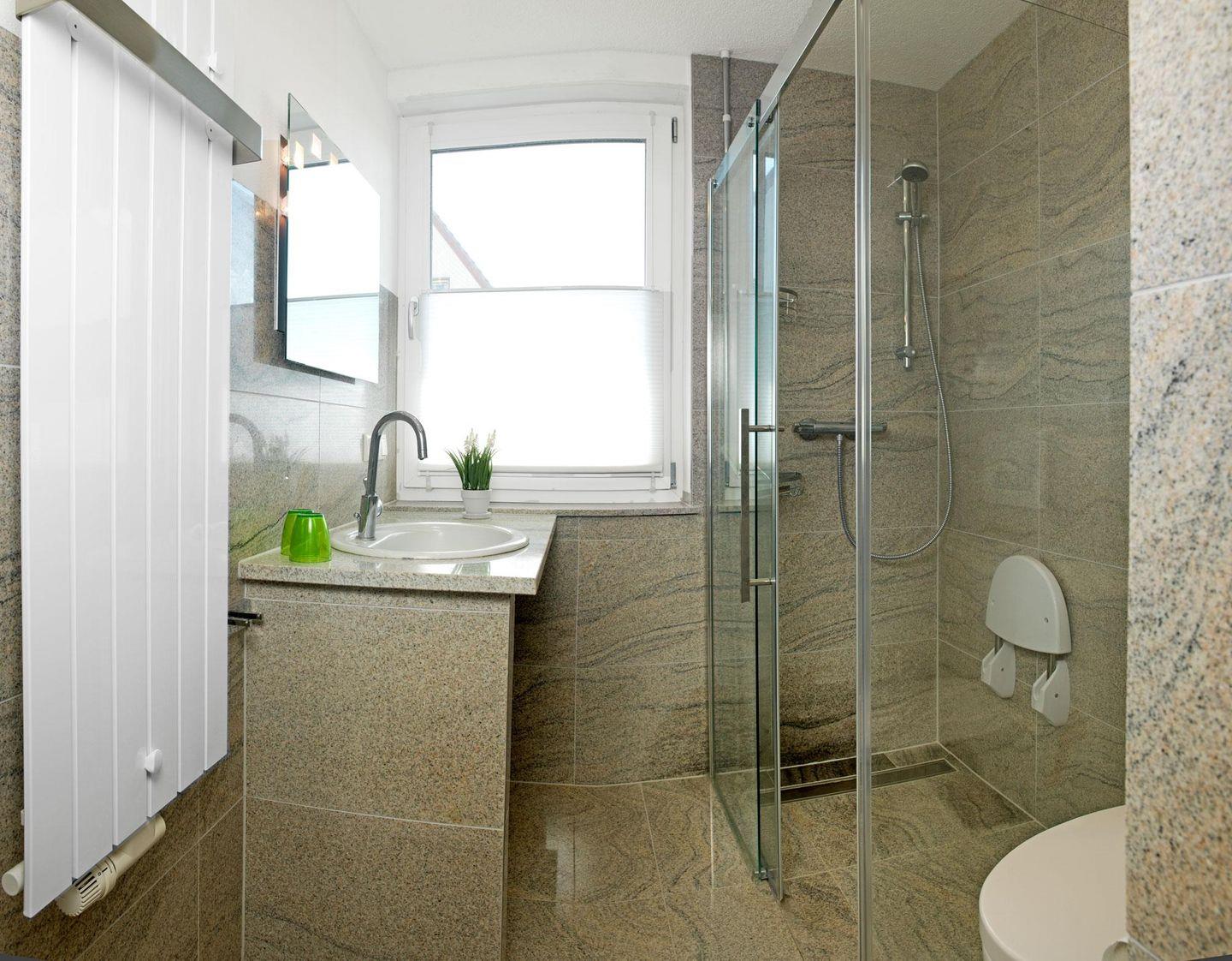 Da die Wohnung ebenerdig und ohne Stufen ist und die Dusche einen Sitz bietet, ist die Wohnung auch für ältere Menschen ideal.