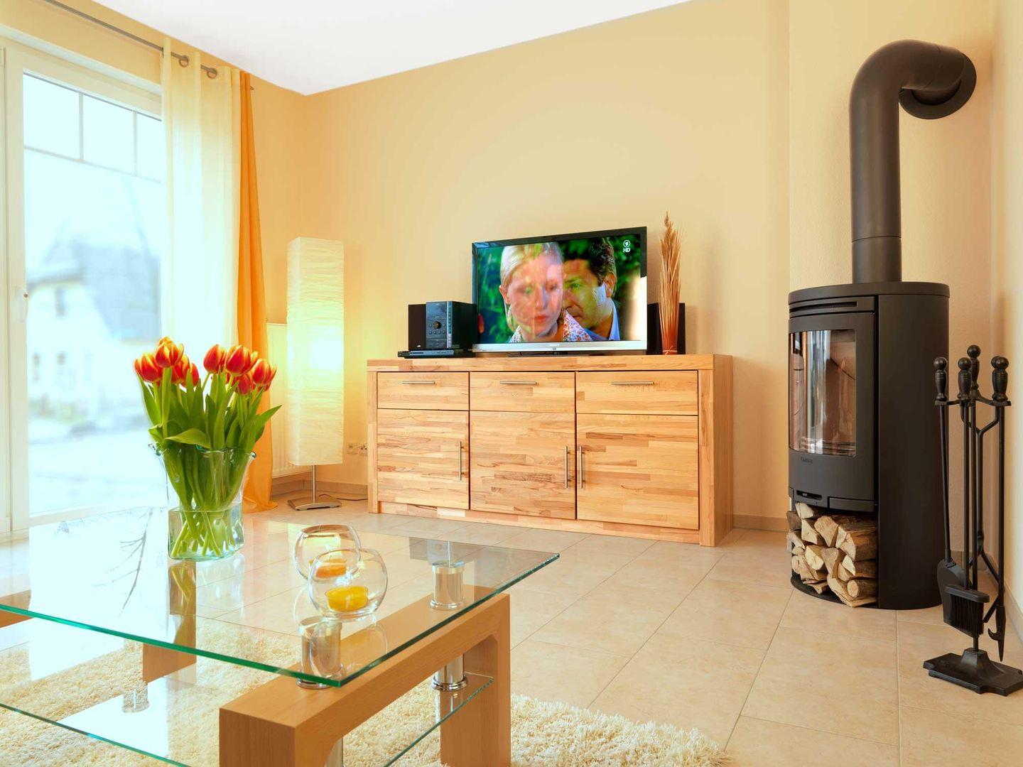 Vom Wohnzimmer mit Kaminofen, Flat-TV, DVD und HiFi-Anlage aus haben Sie direkten Zugang zur Terrasse.