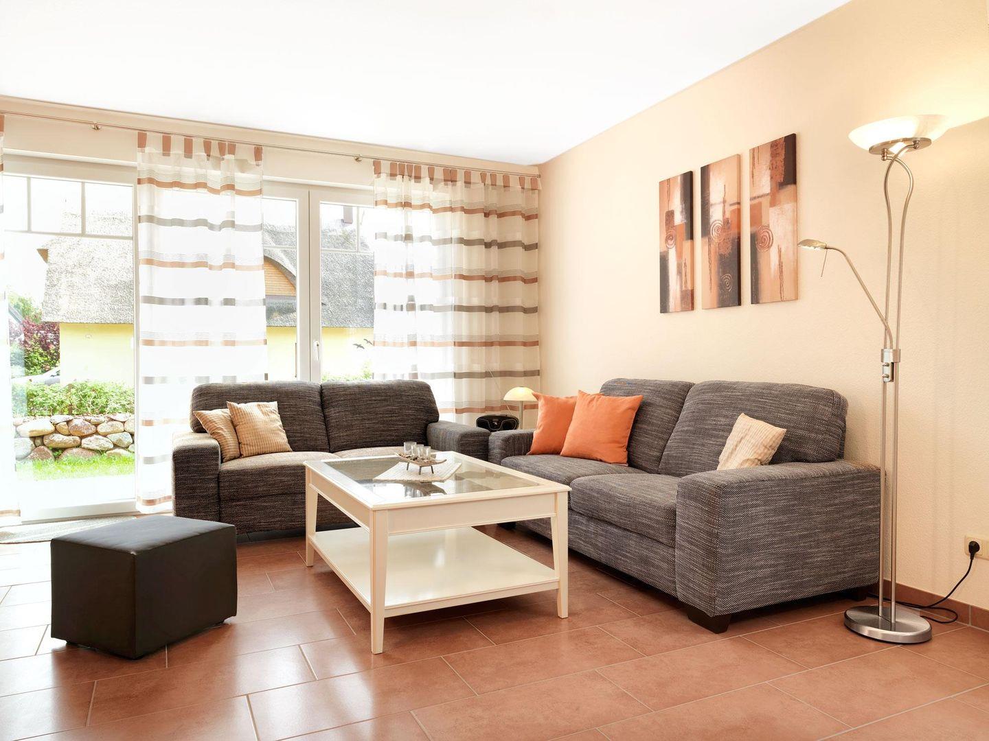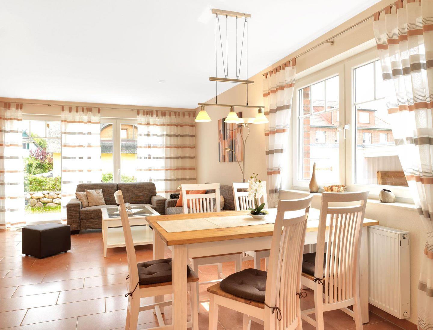 Vom hochwertig und liebevoll eingerichteten Wohnzimmer mit Kaminofen haben Sie direkten Zugang zur Süd-Terrasse, die am Weg zum Strand liegt.