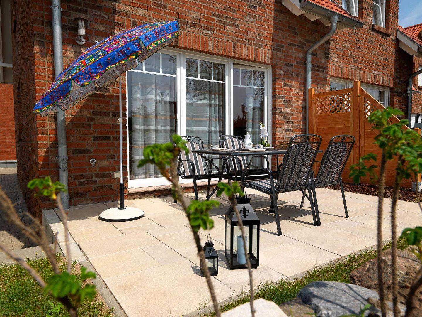 Genießen Sie Ihre Terrasse: Gartenmöbel und Grill stehen für Sie bereit.