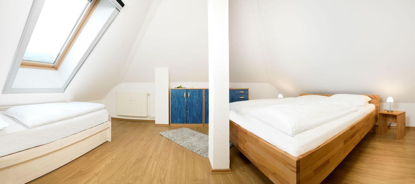 Das großzügige Schlafzimmer liegt im Spitzboden über dem Wohnzimmer.