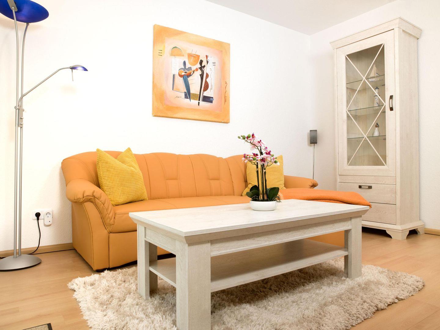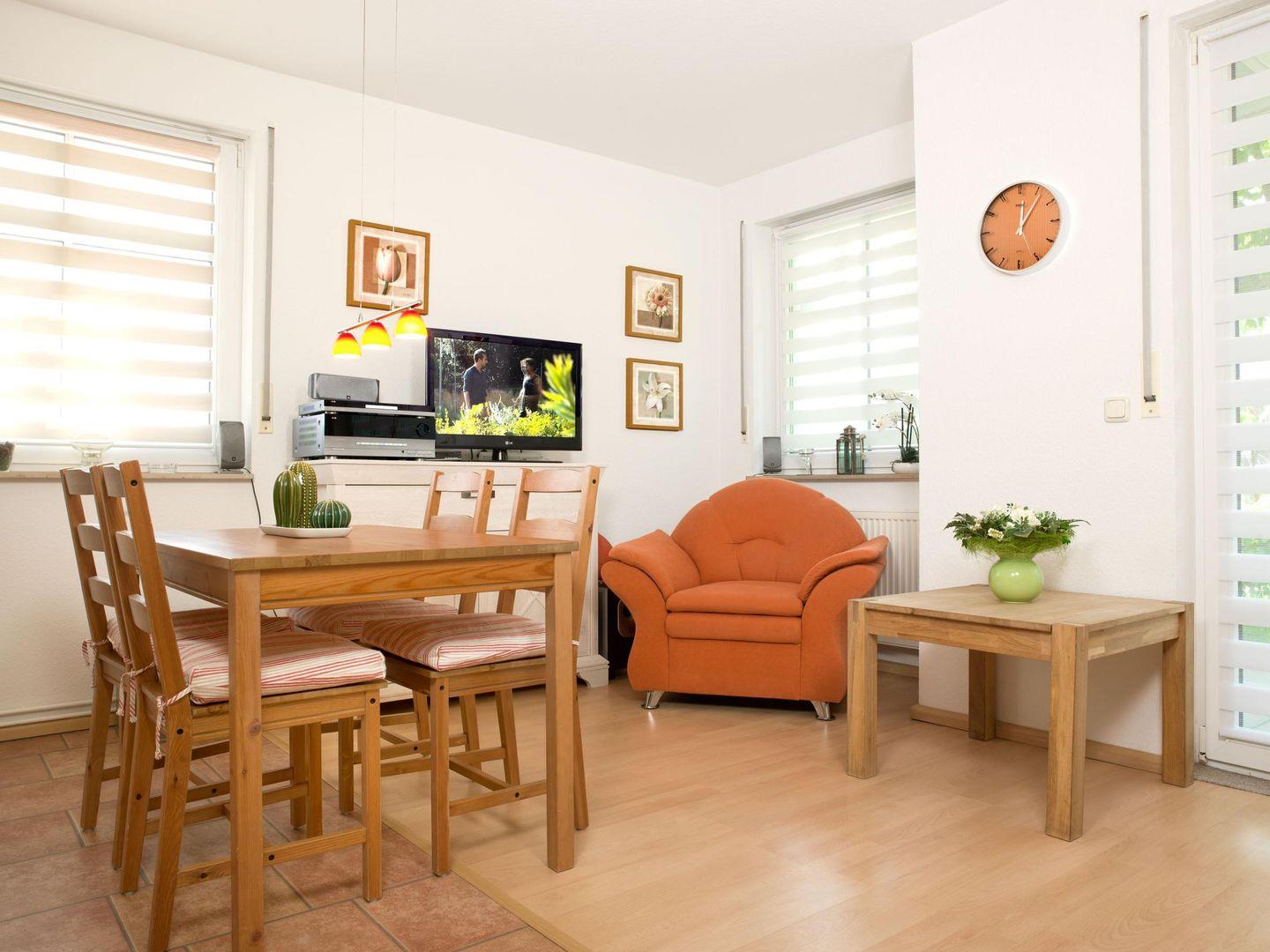Das hübsch eingerichtete Wohnzimmer mit einer offenen und gut ausgestatteten Einbauküche verfügt über TV, Radio und eine gemütliche Essecke.
