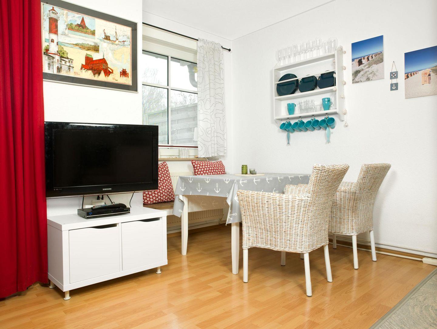 Eine zusätzliche Aufbettung (Schlafcouch 1,60 ) ist im Wohnzimmer für maximal 2 Kinder möglich. Das hübsch eingerichtete Wohnzimmer mit einer offenen und gut ausgestatteten Einbauküche verfügt über TV, Radio und eine gemütliche Essecke.