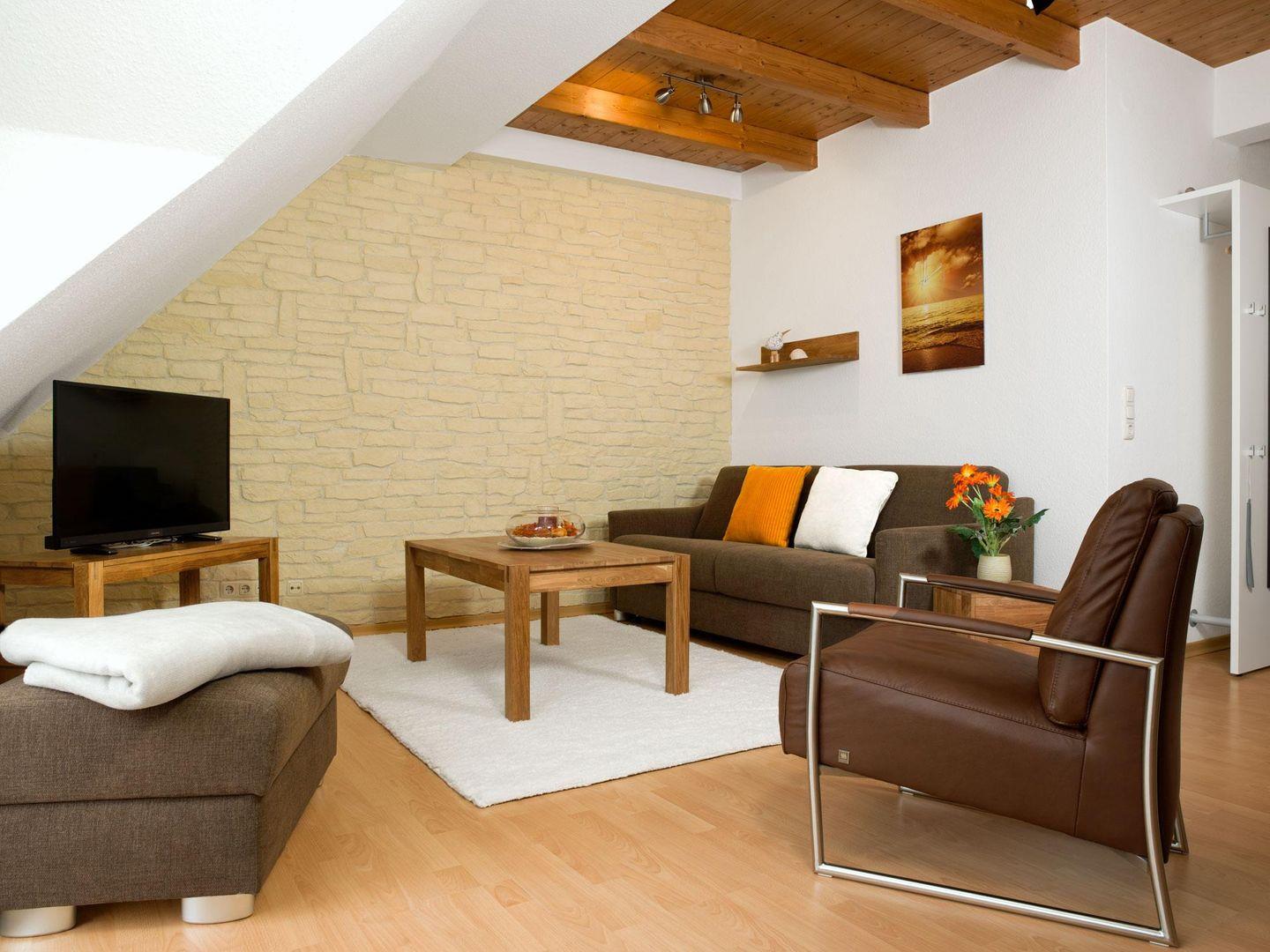 Kuscheliges Wohnzimmer mit TV, HIFI-Anlage und Blick ins Grüne. Von dort aus gelangen Sie auf den schönen Balkon, der mit Gartenmöbeln ausgestattet ist.