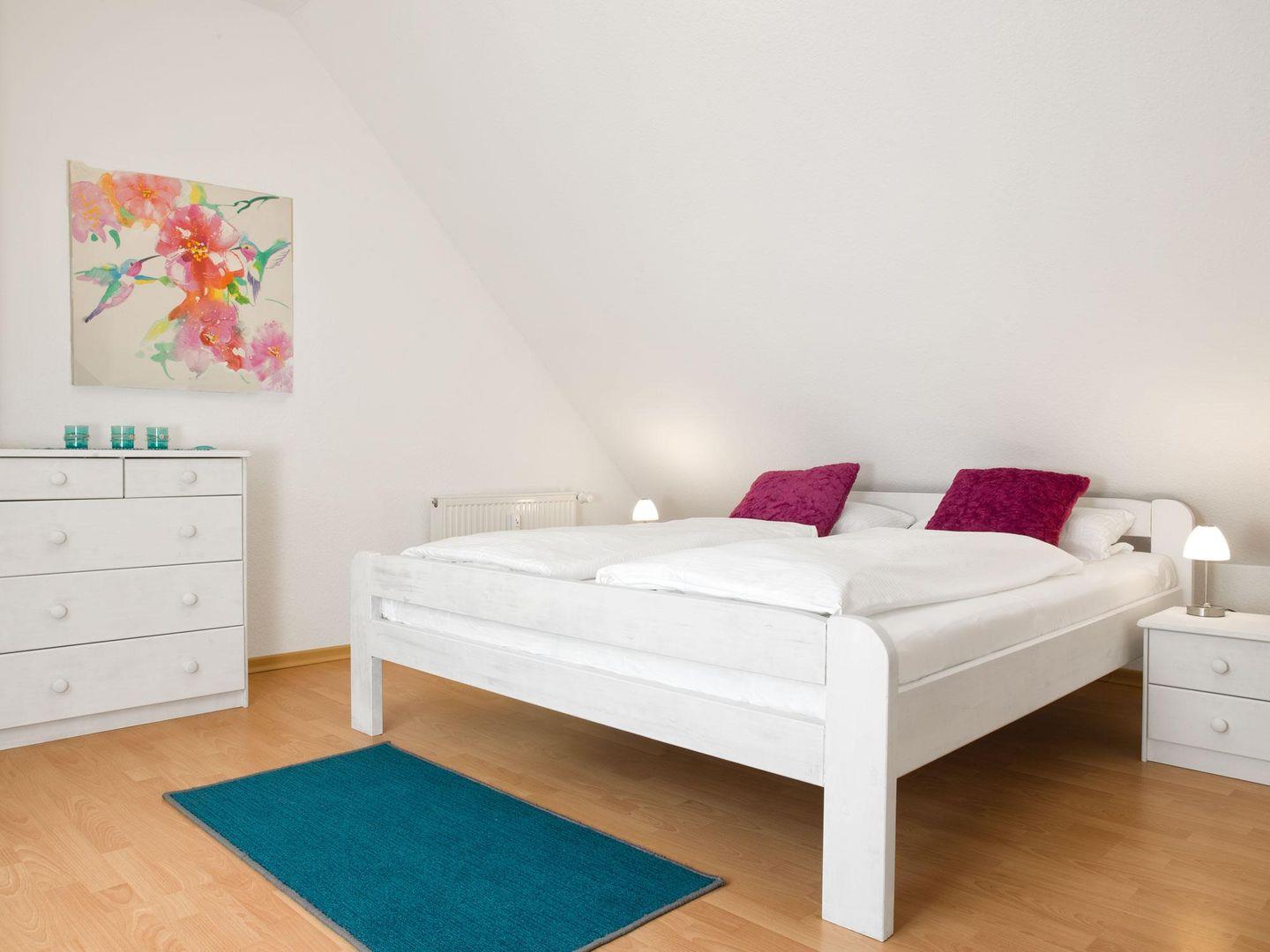 Das großzügige Schlafzimmer liegt im Spitzboden über dem Wohnzimmer. Hier finden Sie ein Doppelbett sowie ein Einzelbett, welches für ein zweites Bett ausgezogen werden kann.