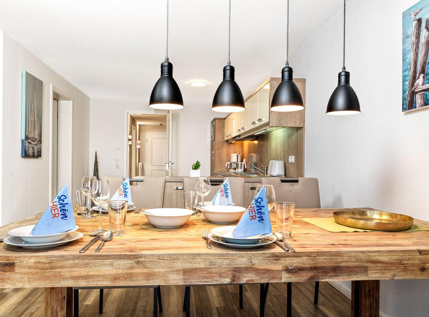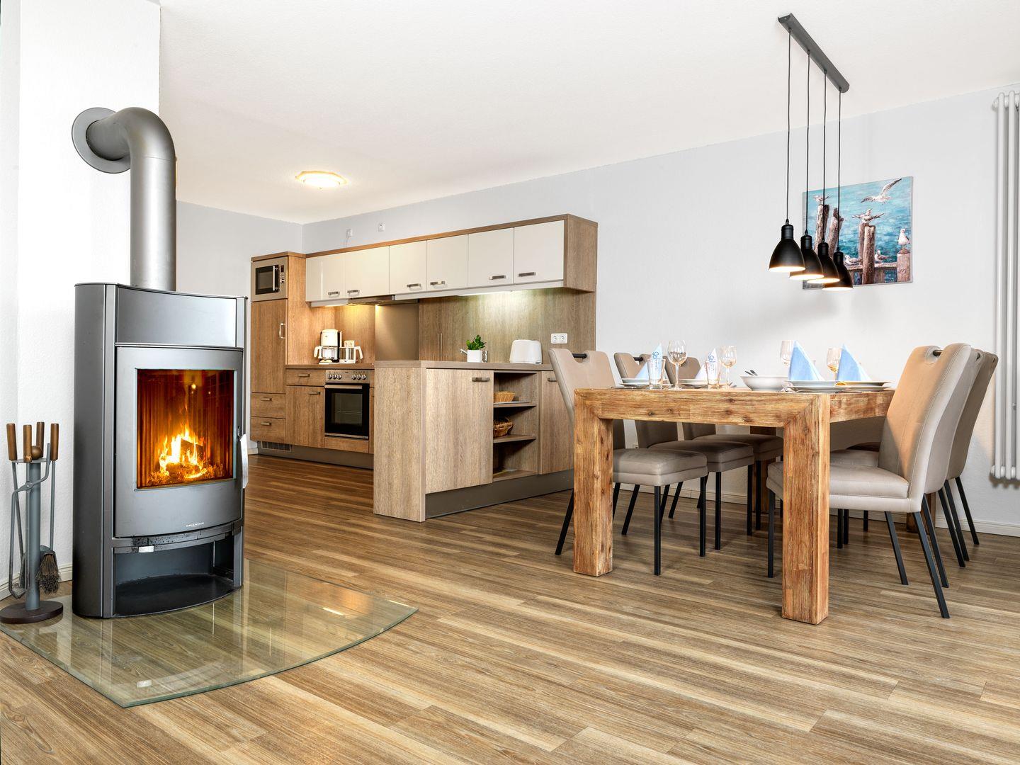 Ein großes Wohnzimmer mit offener Küche, Kaminofen, Schlafcouch sowie ein Balkon mit Hafenblick erwarten Sie!