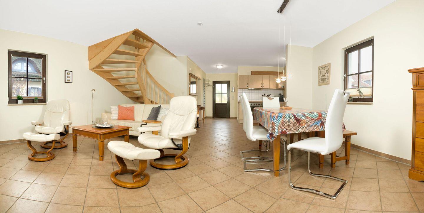 Genießen Sie einen Traumurlaub unter Reet: das große, helle und gemütliche Wohnzimmer mit LCD-TV, Kaminofen und offener Küche lässt keine Wünsche offen. Ein schöner Essbereich mit Blick ins Grüne, ein Bad mit Dusche/WC, ein Hauswirtschaftsraum mit Waschmaschine sowie eine große Terrasse mit Gartenmöbeln, Sonnenschirm, Grill und Liegestühlen warten darauf, Ihnen einen herrlichen Urlaub zu bescheren.