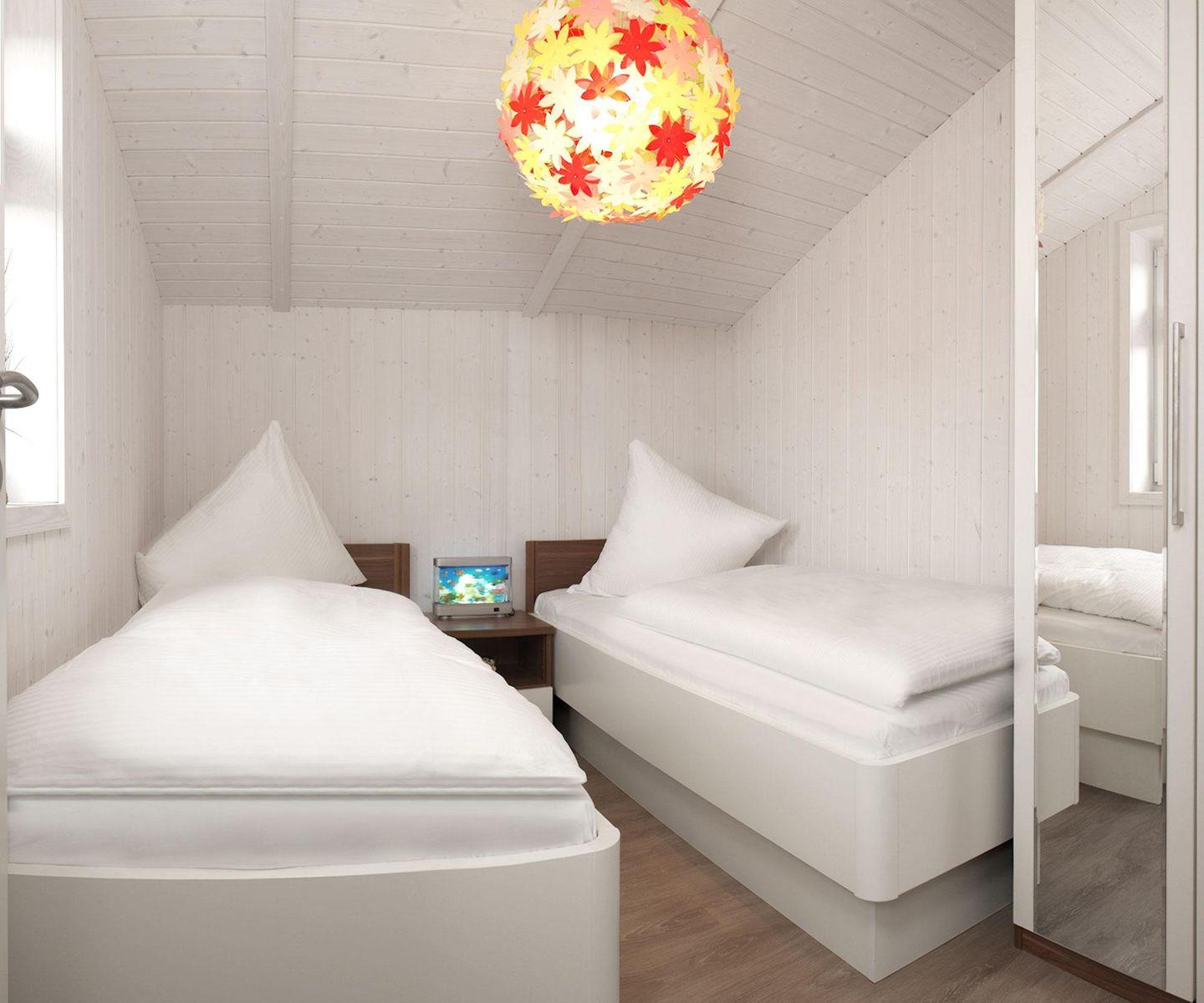 Zwei Schlafzimmer, eines mit Doppelbett und das andere mit zwei Einzelbetten ergänzen die Wohnung. Eine Schlafcouch befindet sich im Wohnzimmer.