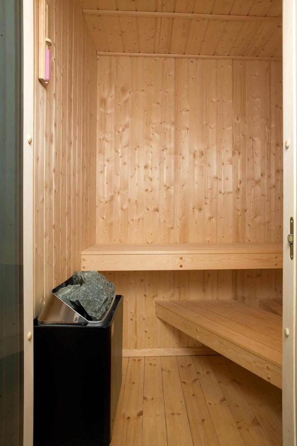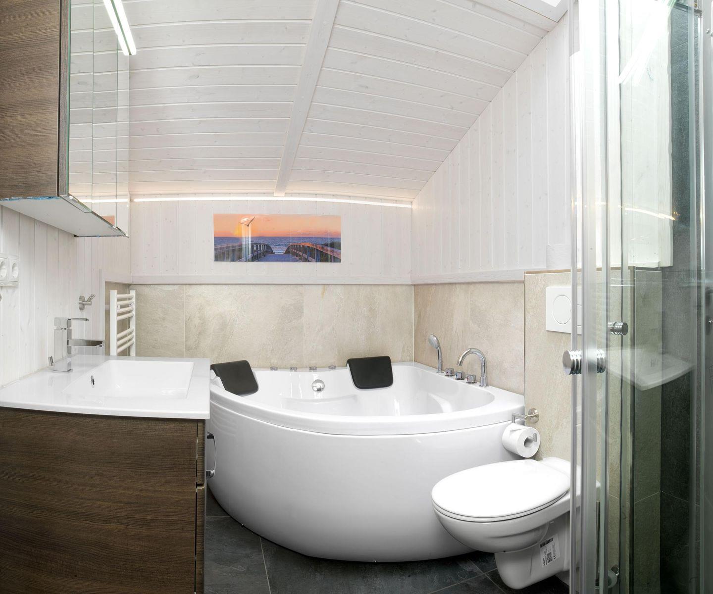 Für kalte Tage erwarten Sie 2 Wellness-Bäder: Ein Bad mit Dusche, WC und Sauna sowie ein Bad mit Whirlpool und WC. Für die Kleinsten ist ein Reisebett vorhanden.