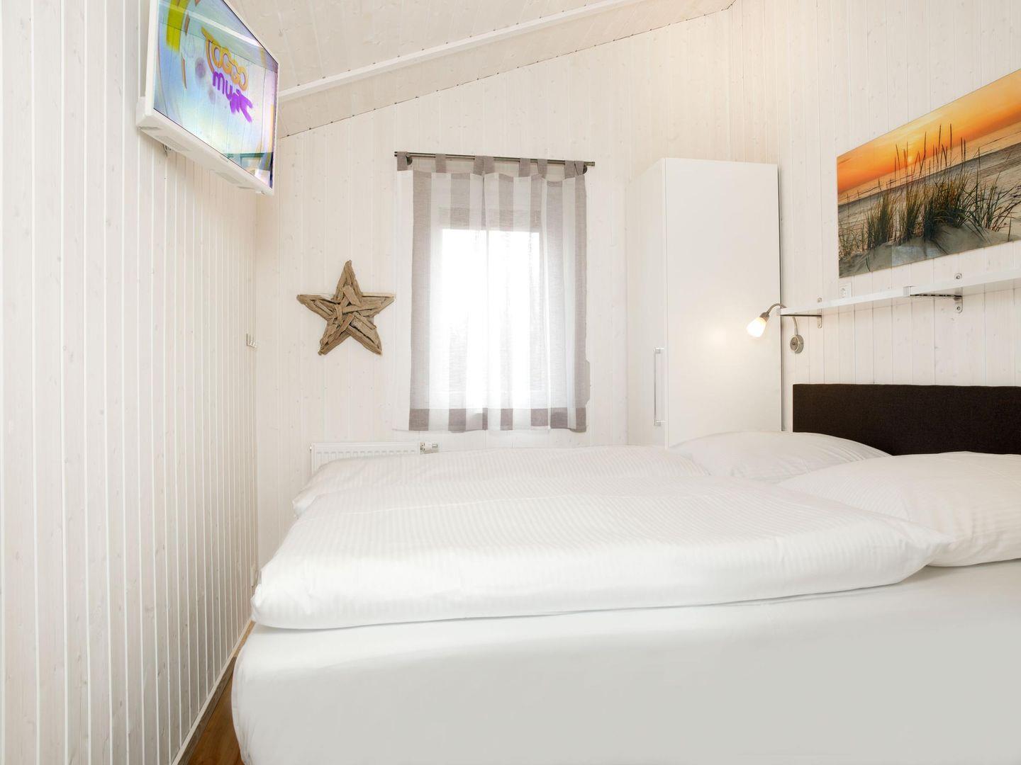 Zwei Schlafzimmer, eines mit Doppelbett sowie TV und das andere mit zwei Einzelbetten mit TV ergänzen das Haus. Eine Schlafcouch befindet sich im Wohnzimmer.