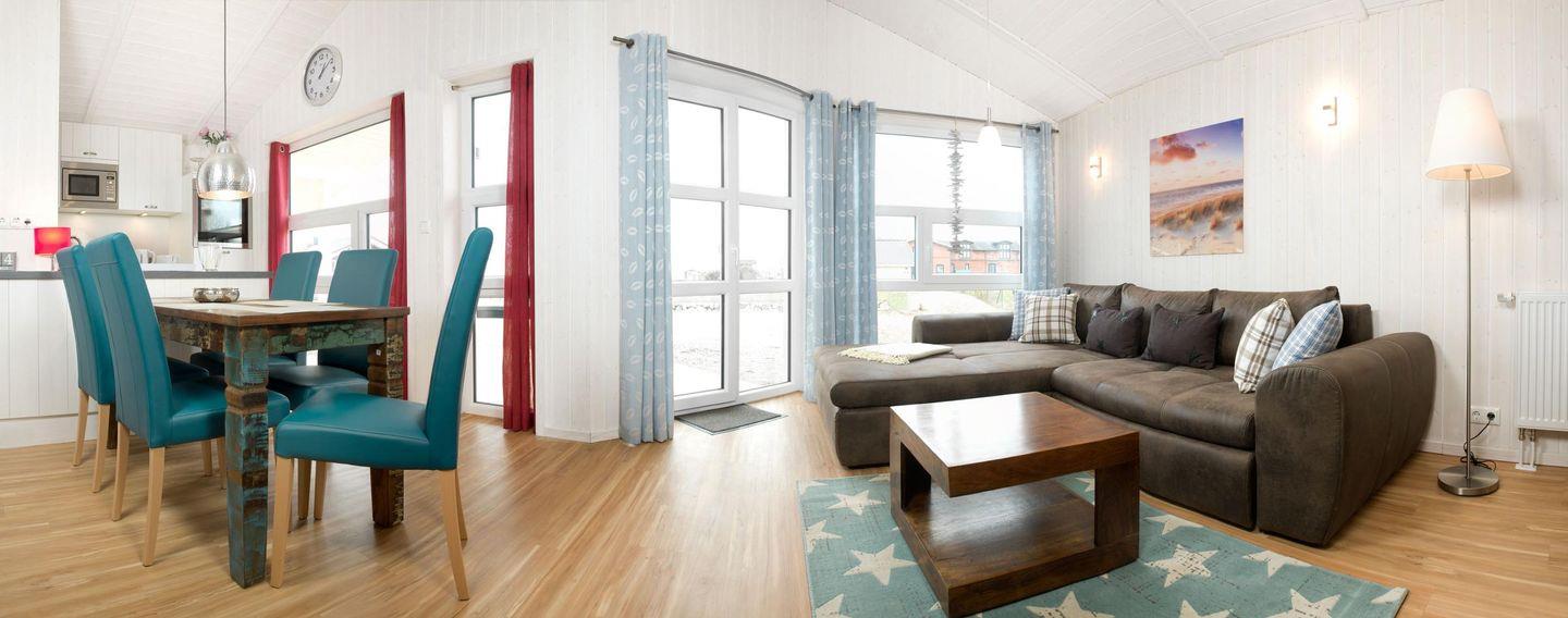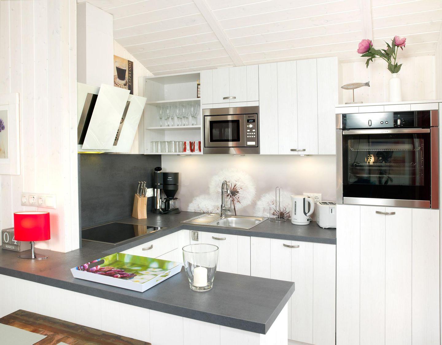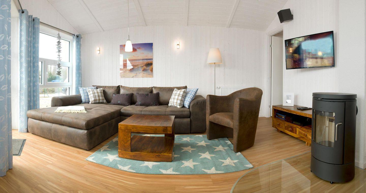 Das Wohnzimmer verfügt über große Fenster und ist modern und hell ausgestattet, von hier aus haben Sie einen schönen Ausblick auf das Salzhaff. Genießen Sie kuschelige Stunden vor dem Kaminofen mit Blick in die Natur. Die offene Küche ist komplett und perfekt ausgestattet. Vom Wohnzimmer gelangt man auf die Terrasse.