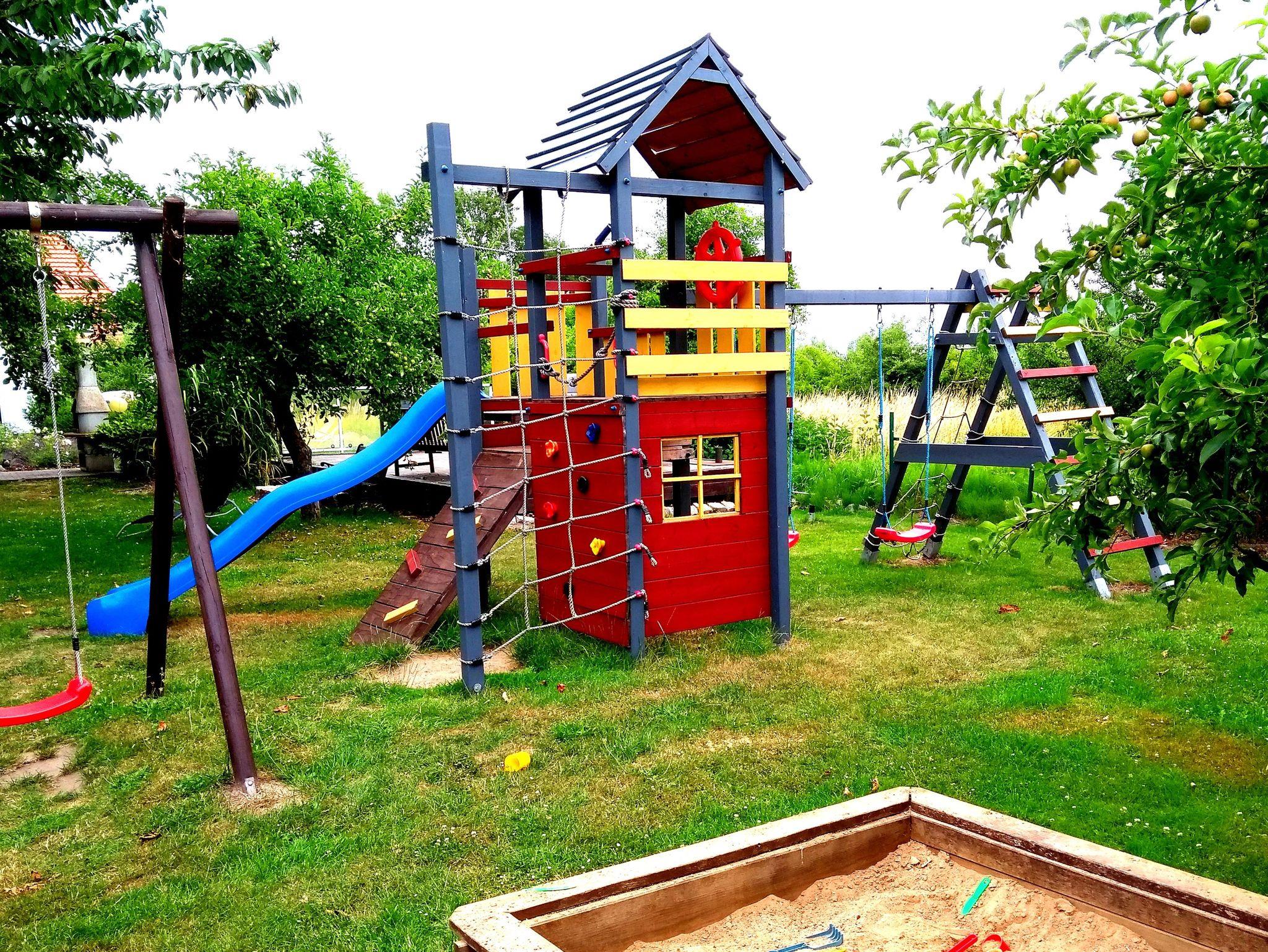 schönem Garten mit Spielgeräten und Grillmöglichkeiten