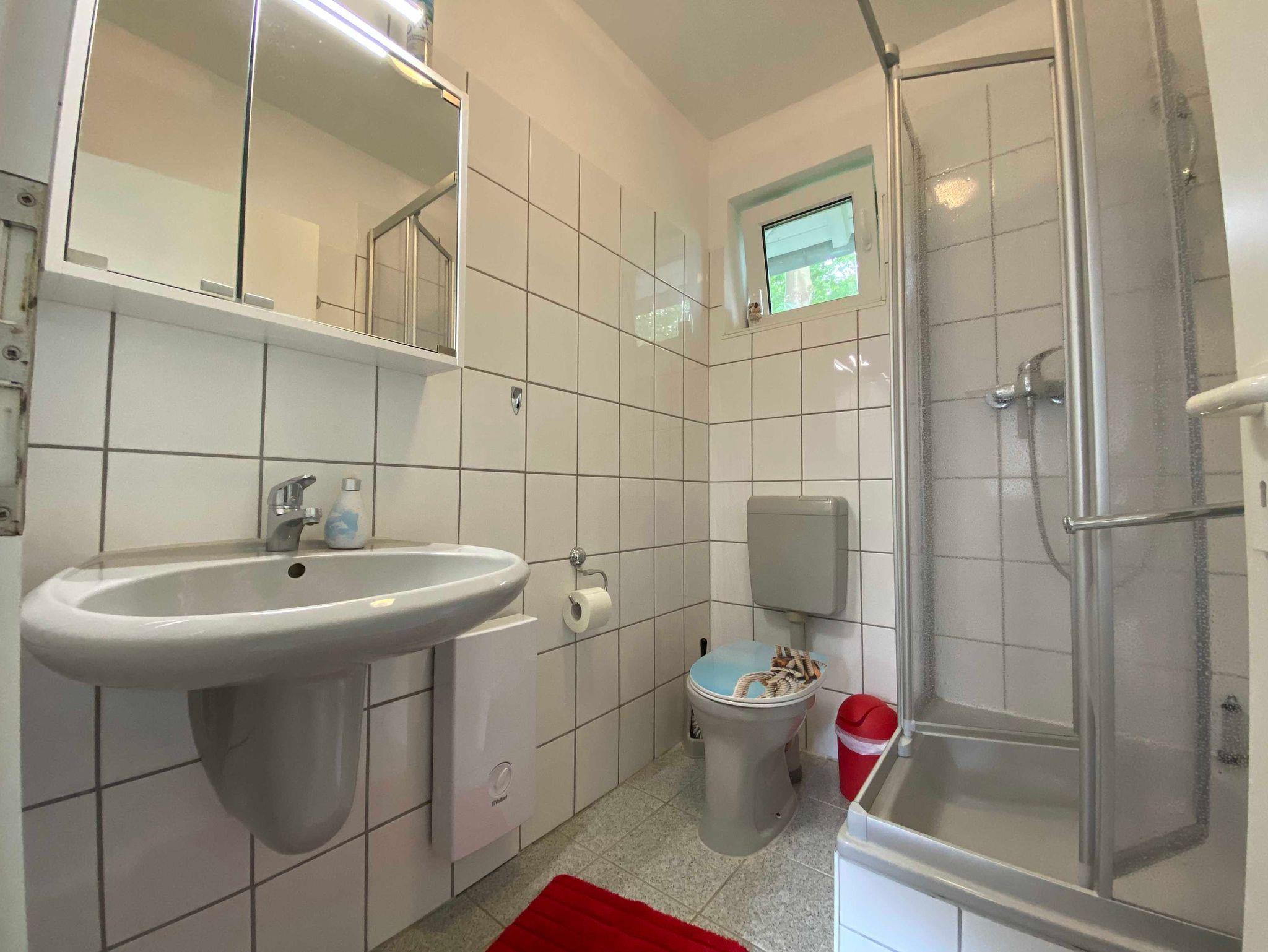 Badezimmer mit Dusche, WC und Haartrockner.