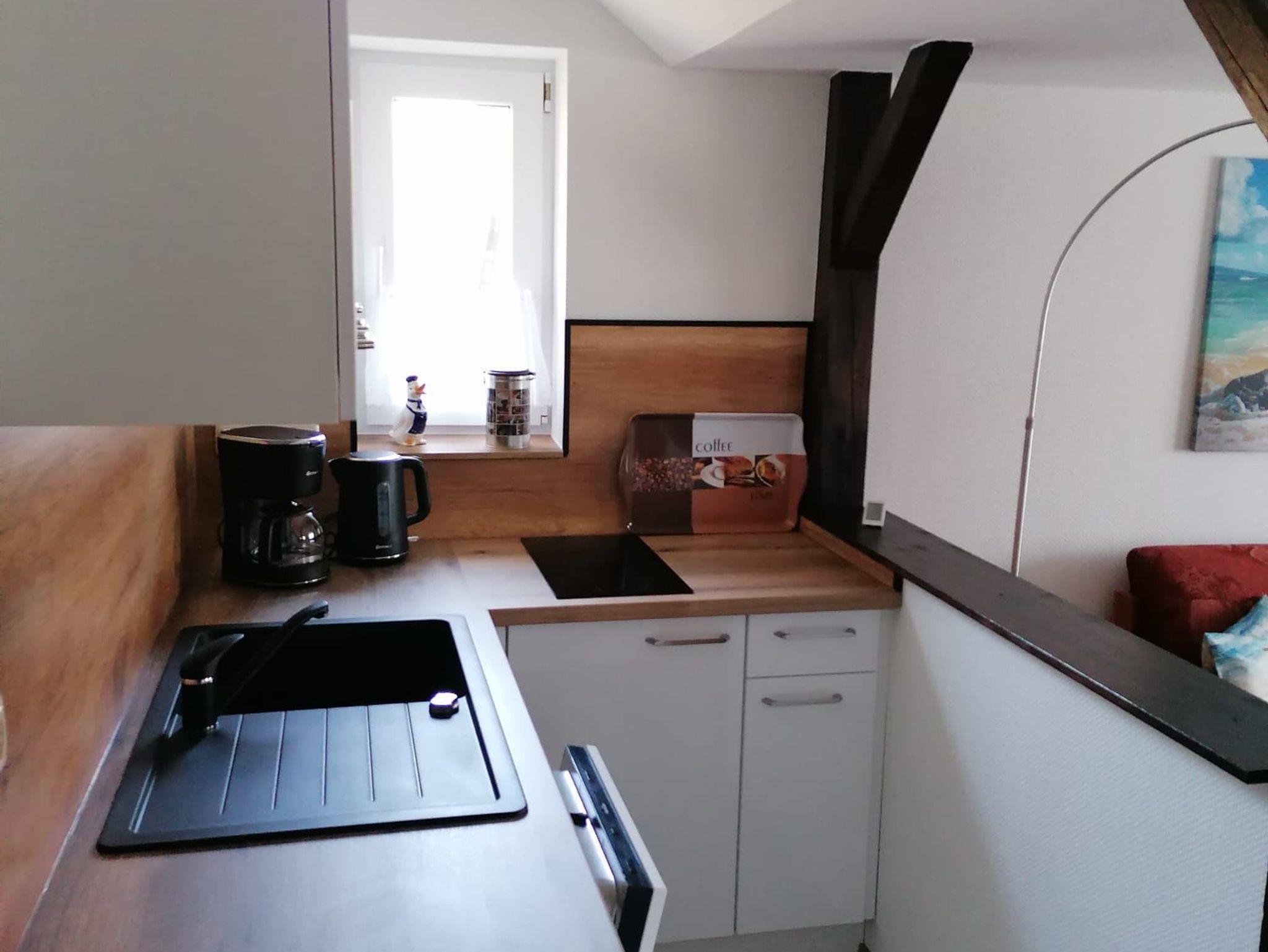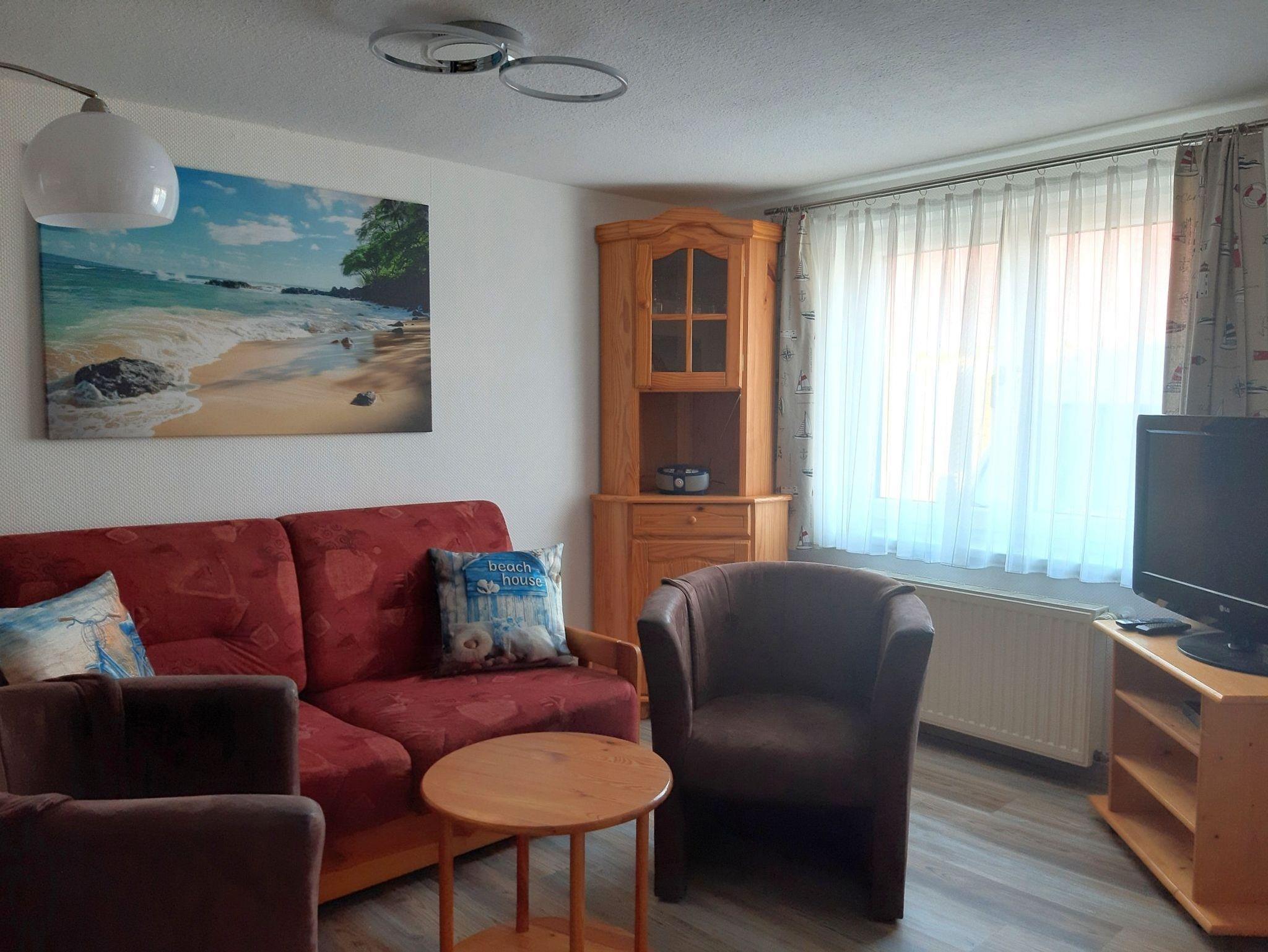 Diese Ferienwohnung verfügt über einen Wohn- und Küchenbereich, mit gemütlichem Funktionssofa (Liegefläche 160 x 200 cm), Couchtisch sowie zwei Sesseln, SAT-TV und separatem Esstisch für bis zu 4 Personen. Die Küche ist mit einem 2er Ceranfeld sowie einer Kühl- und Gefrierkombination und Spülmaschine ausgestattet. Vorhanden sind Kaffeemaschine, Toaster und Wasserkocher sowie Geschirr, Töpfe, Besteck usw. Im Hauswirtschaftsraum steht Ihnen ein Waschtrockner zur Verfügung.