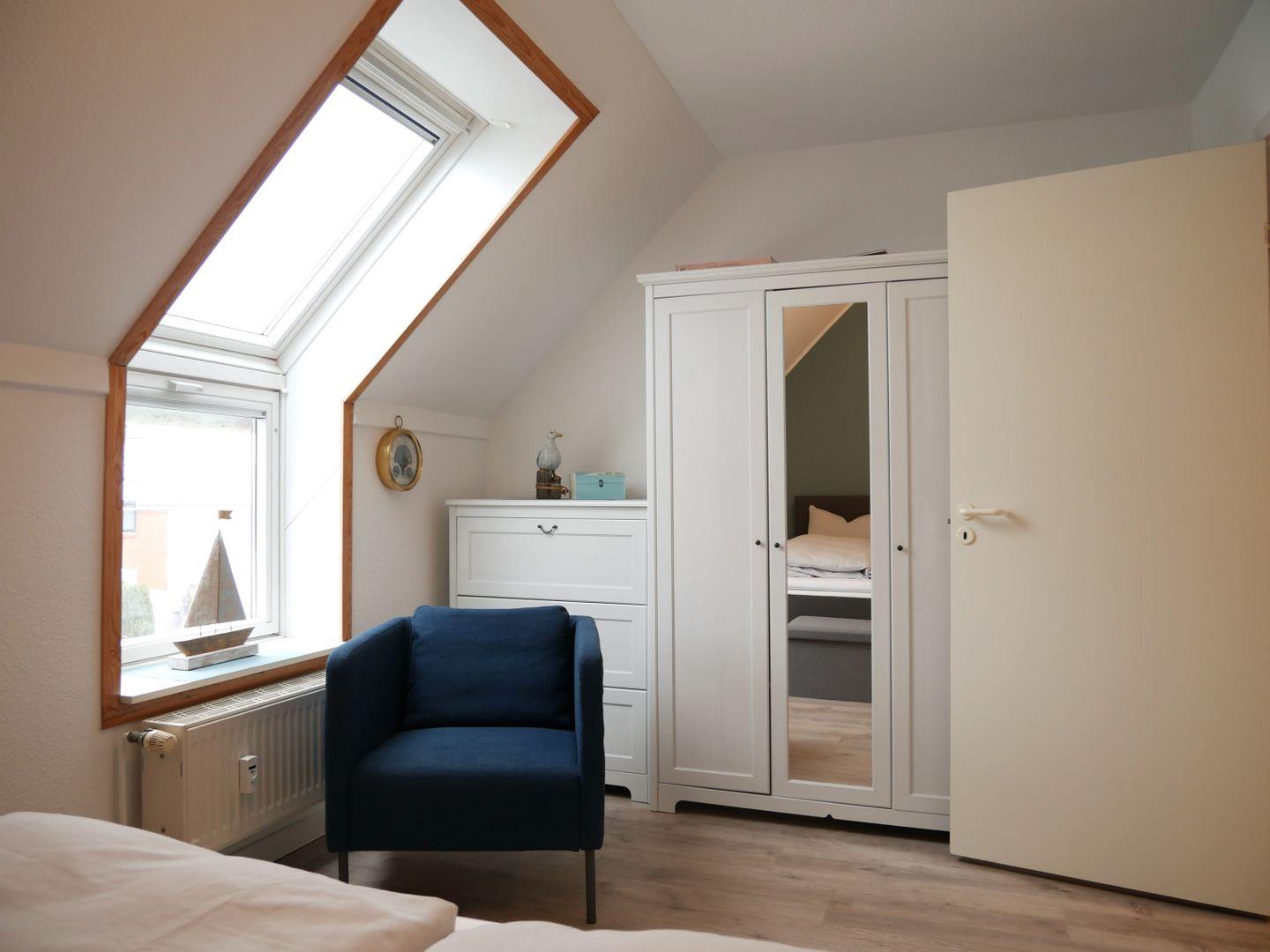 Das separate, helle Schlafzimmer ist mit einem Doppelbett (160x200cm) und genügend Stauraum für Ihre Garderobe möbliert.