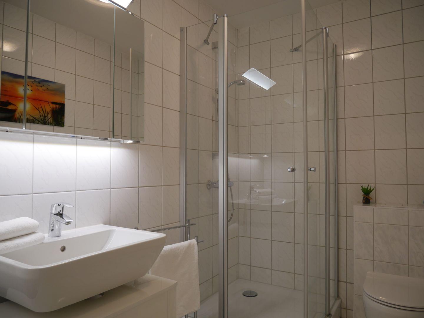 Im Badezimmer befindet sich eine Dusche, Waschtisch und WC.