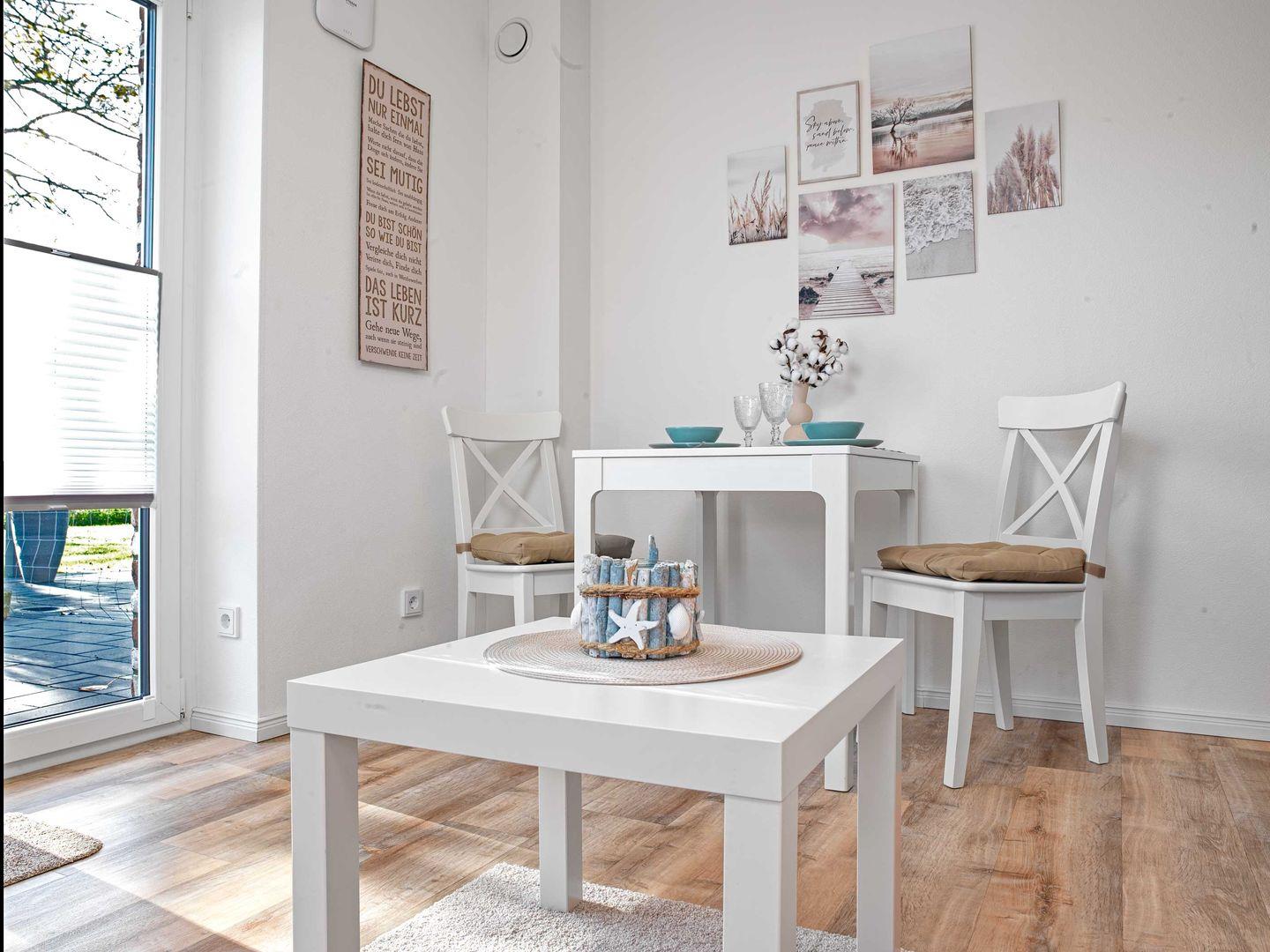 Diese gemütliche 2-Raum-Wohnung bietet Ihnen allen Komfort, den Sie im Urlaub wünschen: ein großzügiges Bad mit Dusche und WC, Wohn-Zimmer mit Couch, Esstisch und TV. Die Küche mit Herd/Cerankochfeld, Kaffeemaschine, Toaster, Wasserkocher etc. befindet sich gleich nebenan.