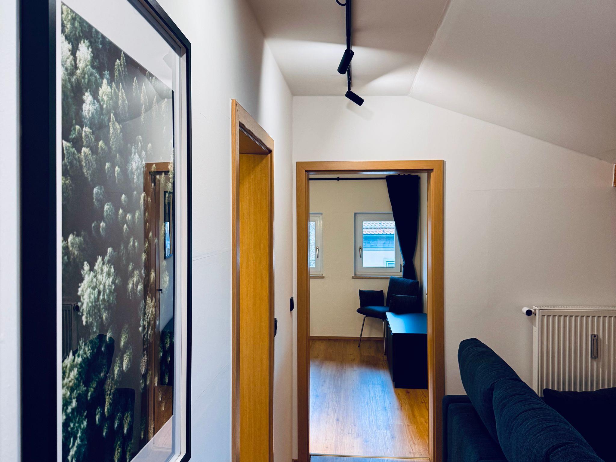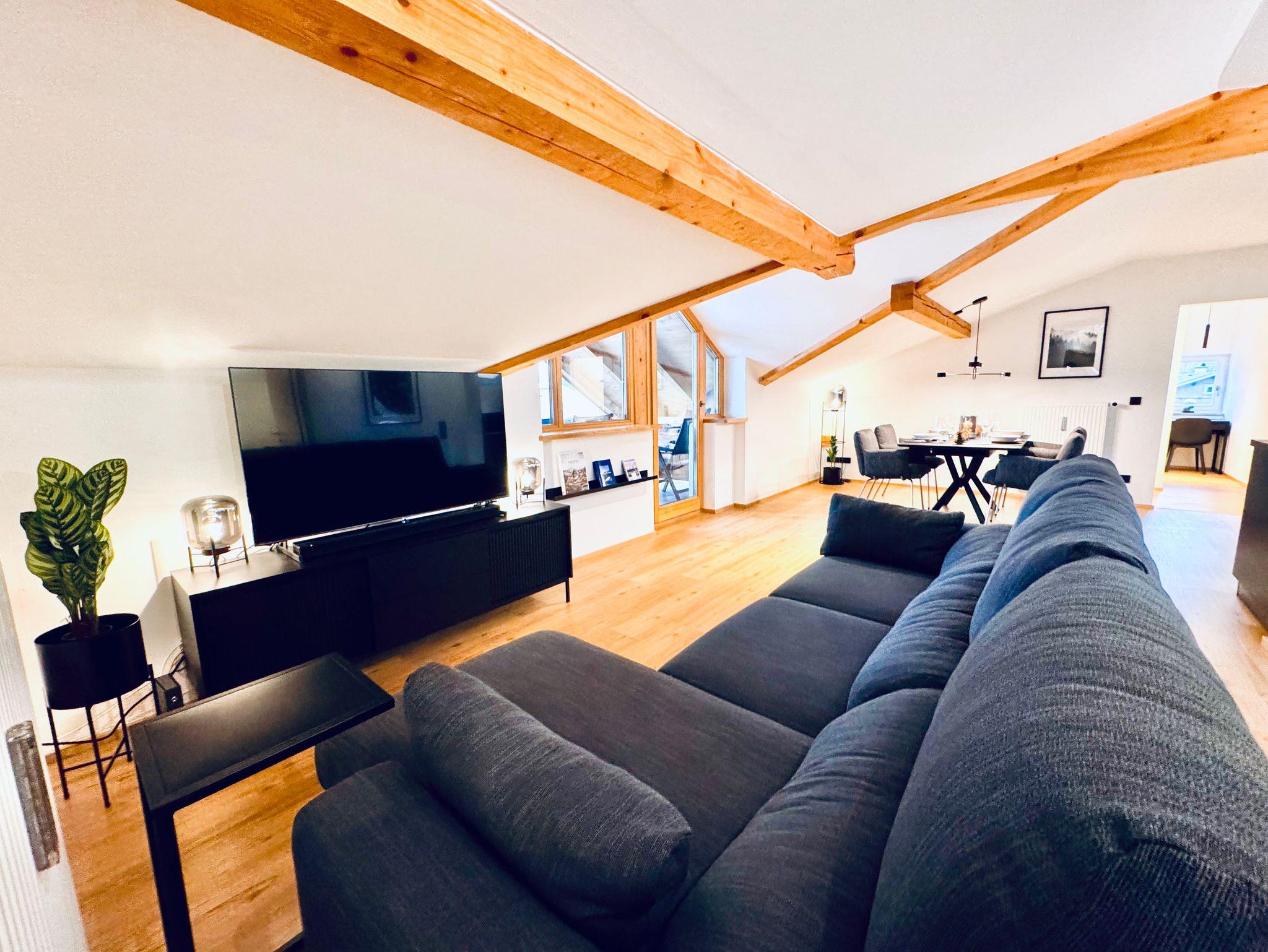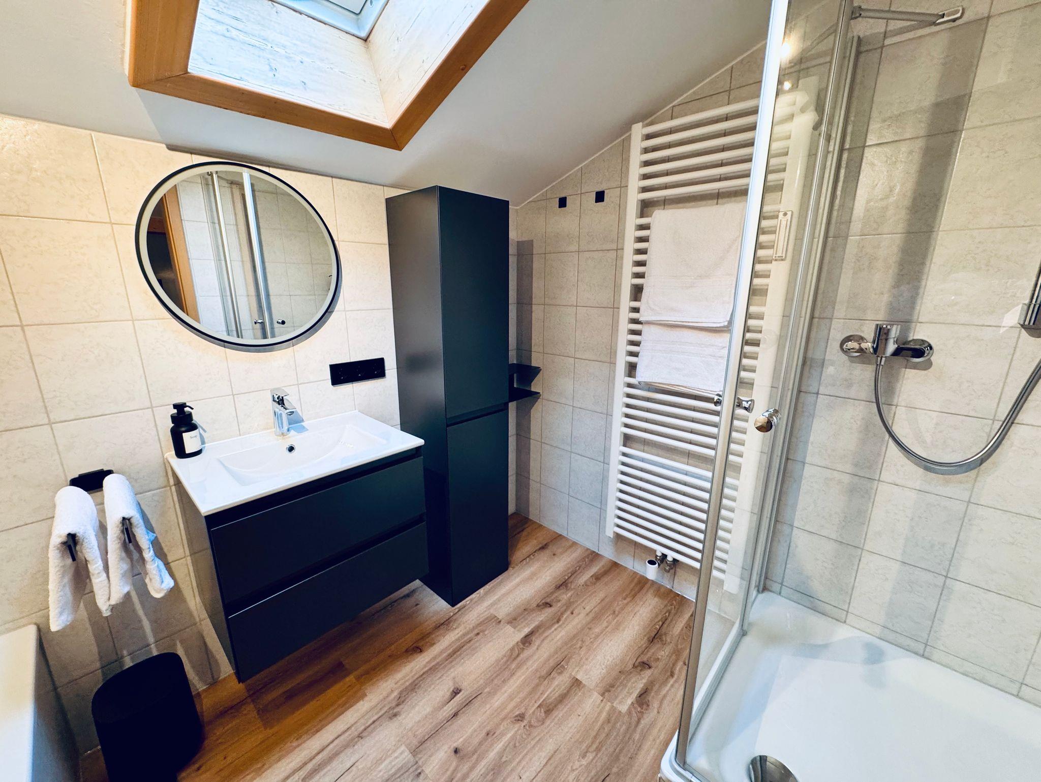 Die Tannensuite befindet sich im 2. Stock (oberstes Stockwerk) und ist über eine Treppe erreichbar. Das Appartement ist ca. 80 qm groß und zeichnet sich durch eine hochwertige Ausstattung mit modernem Design aus. Der Eingangsbereich verfügt über eine Garderobe und vielen Ablagemöglichkeiten. In beiden Schlafzimmer stehen luxuriöse RUF-Boxspring-Betten (King Size). Angrenzend an das Master-Schlafzimmer befindet sich eine Ankleide mit genügend Stauraum für Kleidung, Koffer etc. Für Home Office stehen zwei Tische mit Stühlen zur Verfügung. Herzstück ist das große Wohnzimmer mit offenem Küchen- und Essbereich sowie einer gemütlichen TV-Ecke. Von hier gelangt man auch auf den Balkon mit Bergblick. Abgerundet wird die Tannensuite durch ein geräumiges Bad mit Dusche und Badewanne. Alle Zimmer sind mit Fenstern ausgestattet.