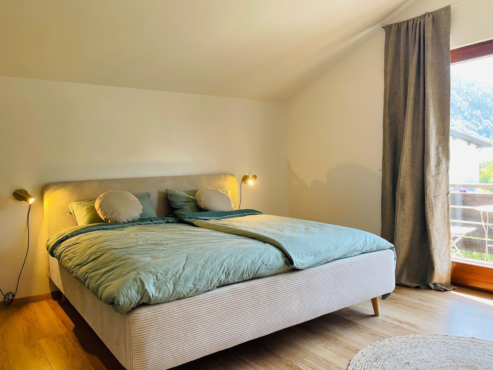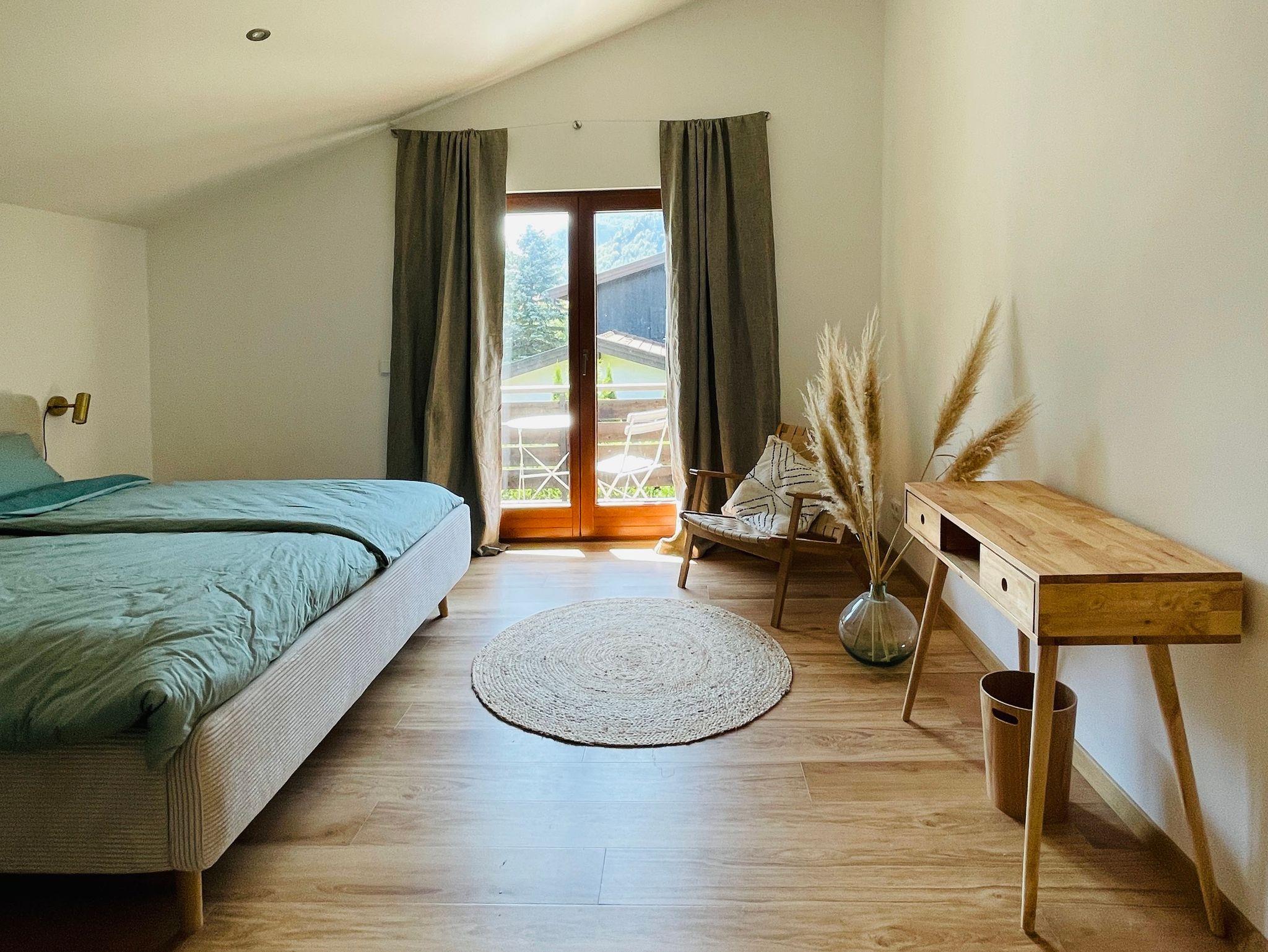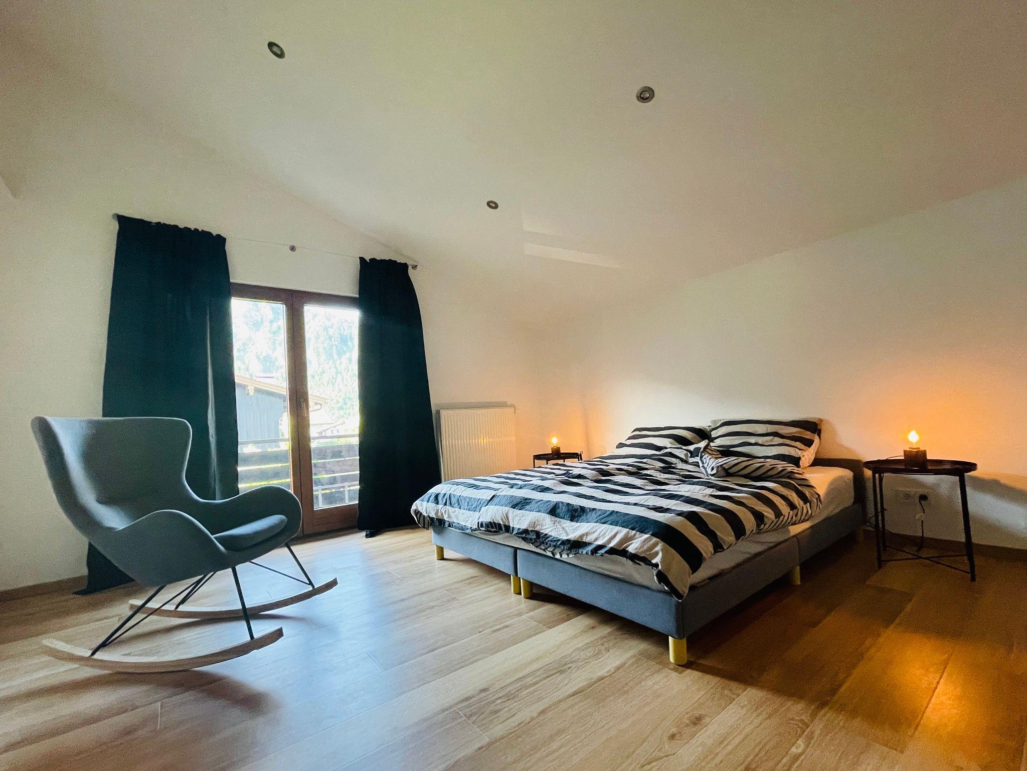 Im Obergeschoss befinden sich die 3 Schlafzimmer und 1 Badezimmer. 2 Schlafzimmer haben ein großes Doppelbett (180 x 200 cm). Das 3. Schlafzimmer verfügt über 2 Einzelbetten (90 x 200 cm), die auch zu einem Doppelbett zusammengeschoben werden können. Das helle Tageslichtbad im Obergeschoss verfügt über eine geräumige Dusche, ein Waschbecken und ein WC. Der überdachte Balkon mit tollem Blick auf die angrenzenden Berge lädt ebenfalls zum Entspannen ein.