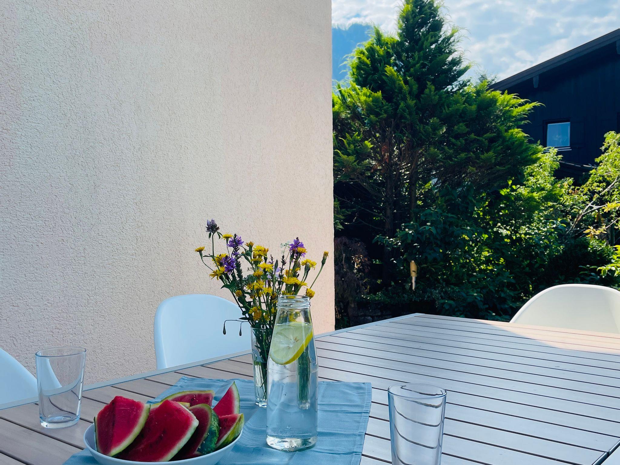 Vom Wohn-Essbereich gelangen Sie auf die große Sonnenterrasse mit traumhaften Rundum-Bergblick. Schöne Gartenmöbel, eine Lounge Ecke und ein Grill warten auf Sie.