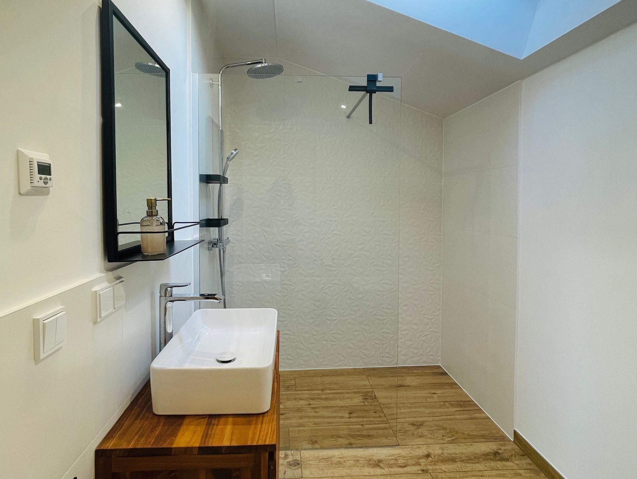 Das helle Tageslichtbad im Obergeschoss verfügt über eine geräumige Dusche, ein Waschbecken und ein WC. Der überdachte Balkon mit tollem Blick auf die angrenzenden Berge lädt ebenfalls zum Entspannen ein.