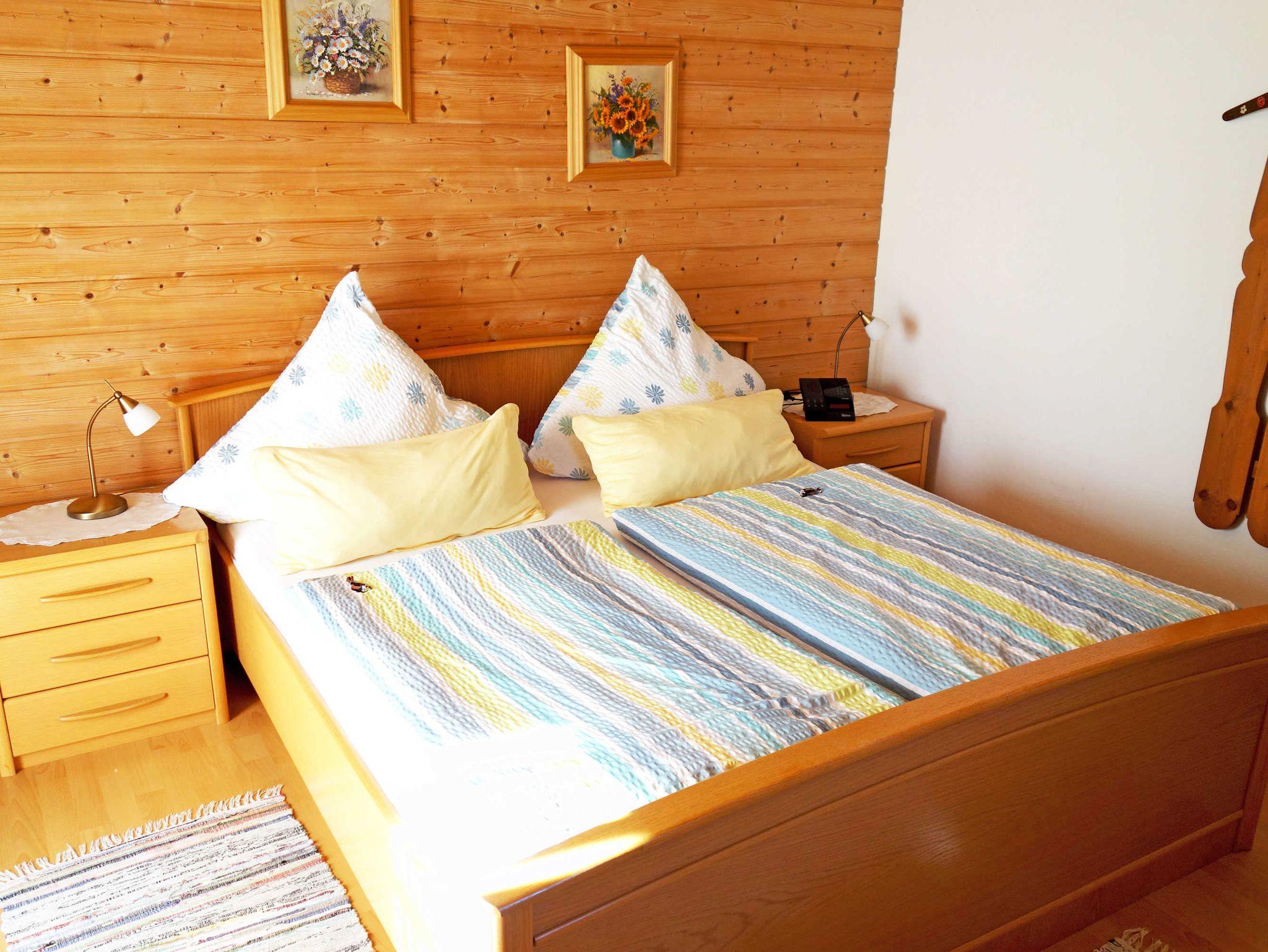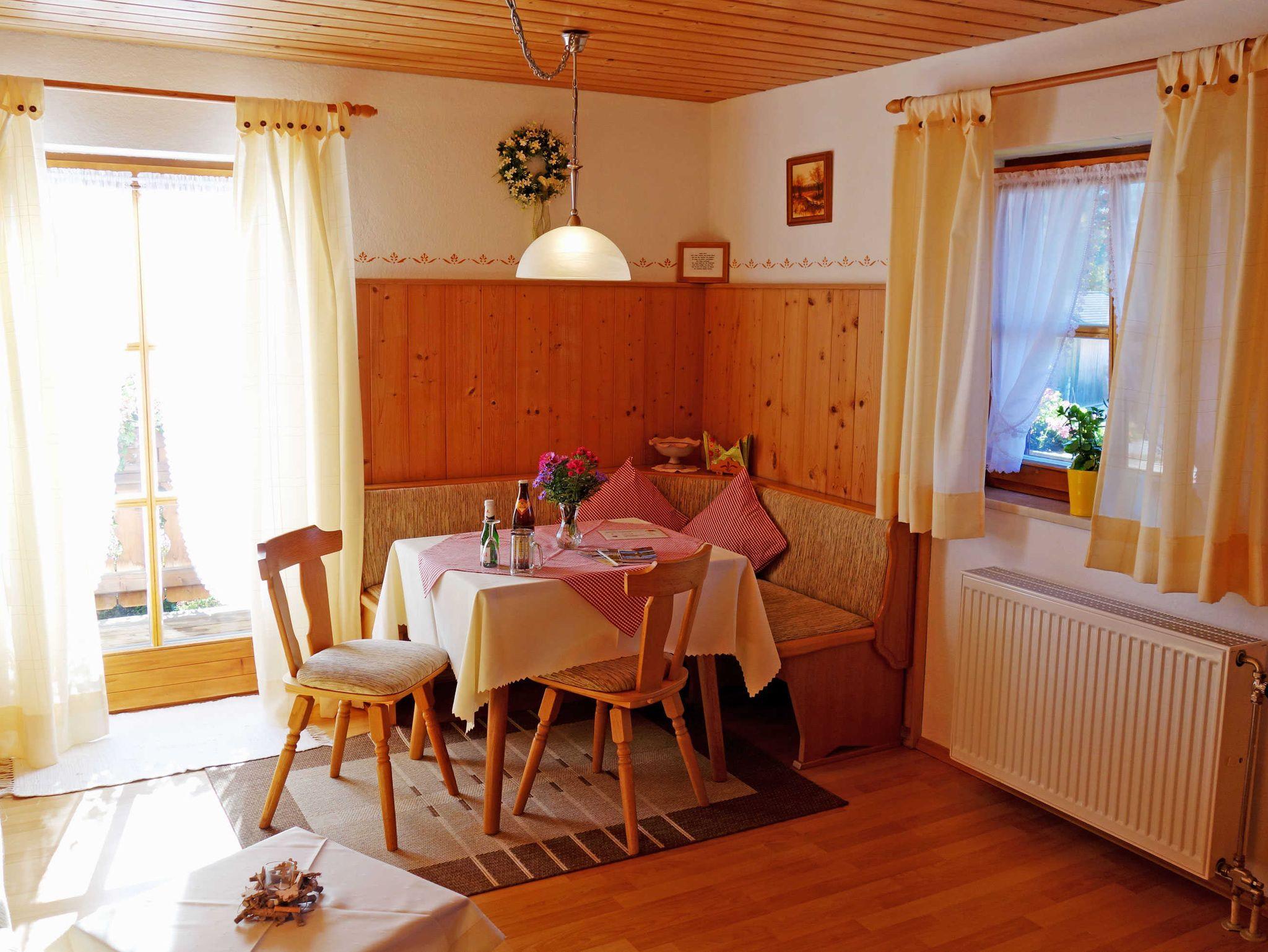 Unsere gemütlich und ländlich eingerichtete Ferienwohnung Gamsknogel (38 qm, 2 Gäste) mit Balkon Richtung Osten und Süden herrlichem Bergpanorama bietet Ihnen ein im bäuerlichen Stil eingerichtetes Schlafzimmer mit Bad mit Dusche/WC und einen gemütlichen Wohnraum mit Essplatz, Couch und voll ausgestatteter Küchenzeile.