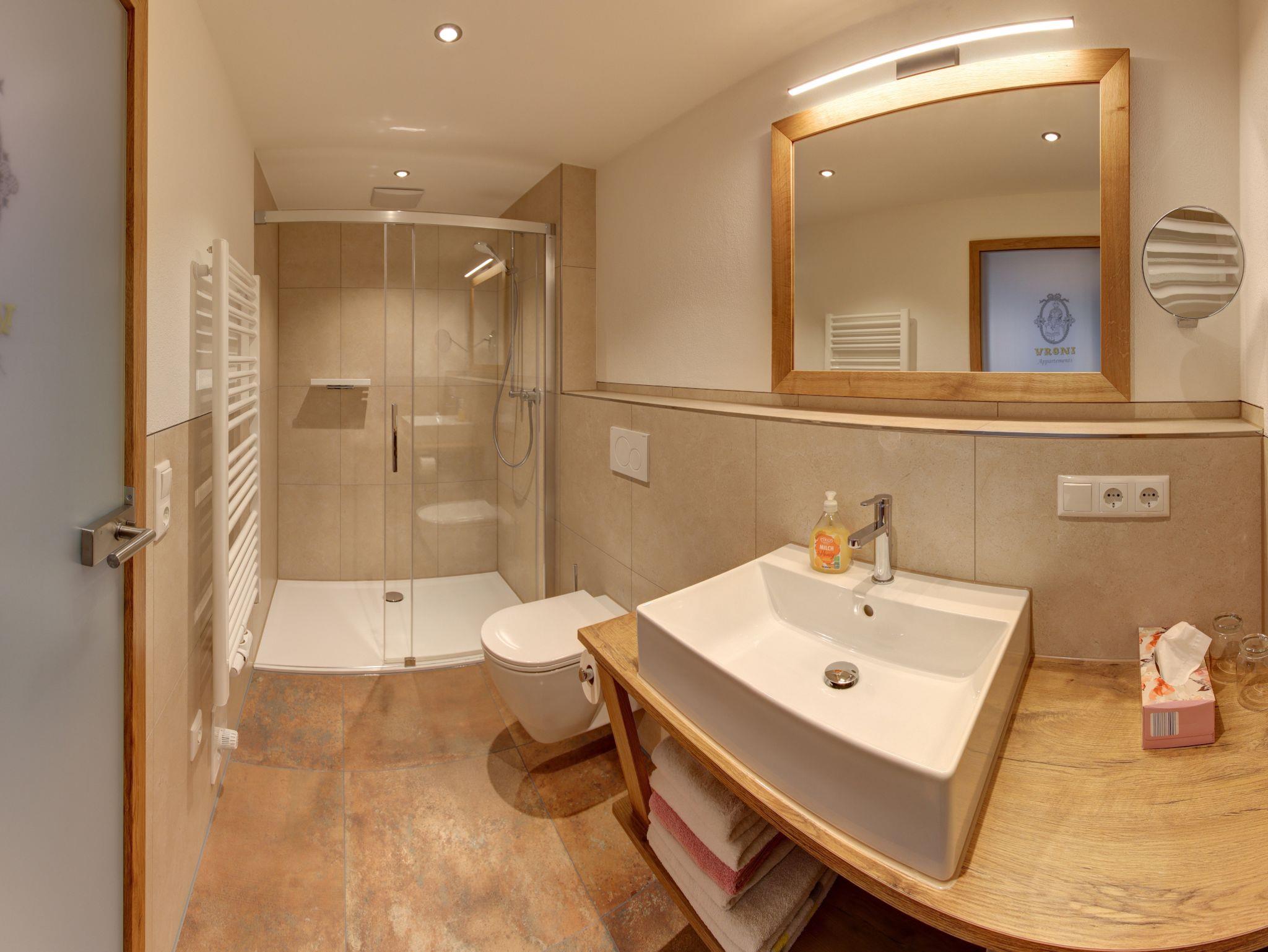 Badezimmer mit Glasdusche, Kosmetikspiegel, Handtuchtrockner, Föhn