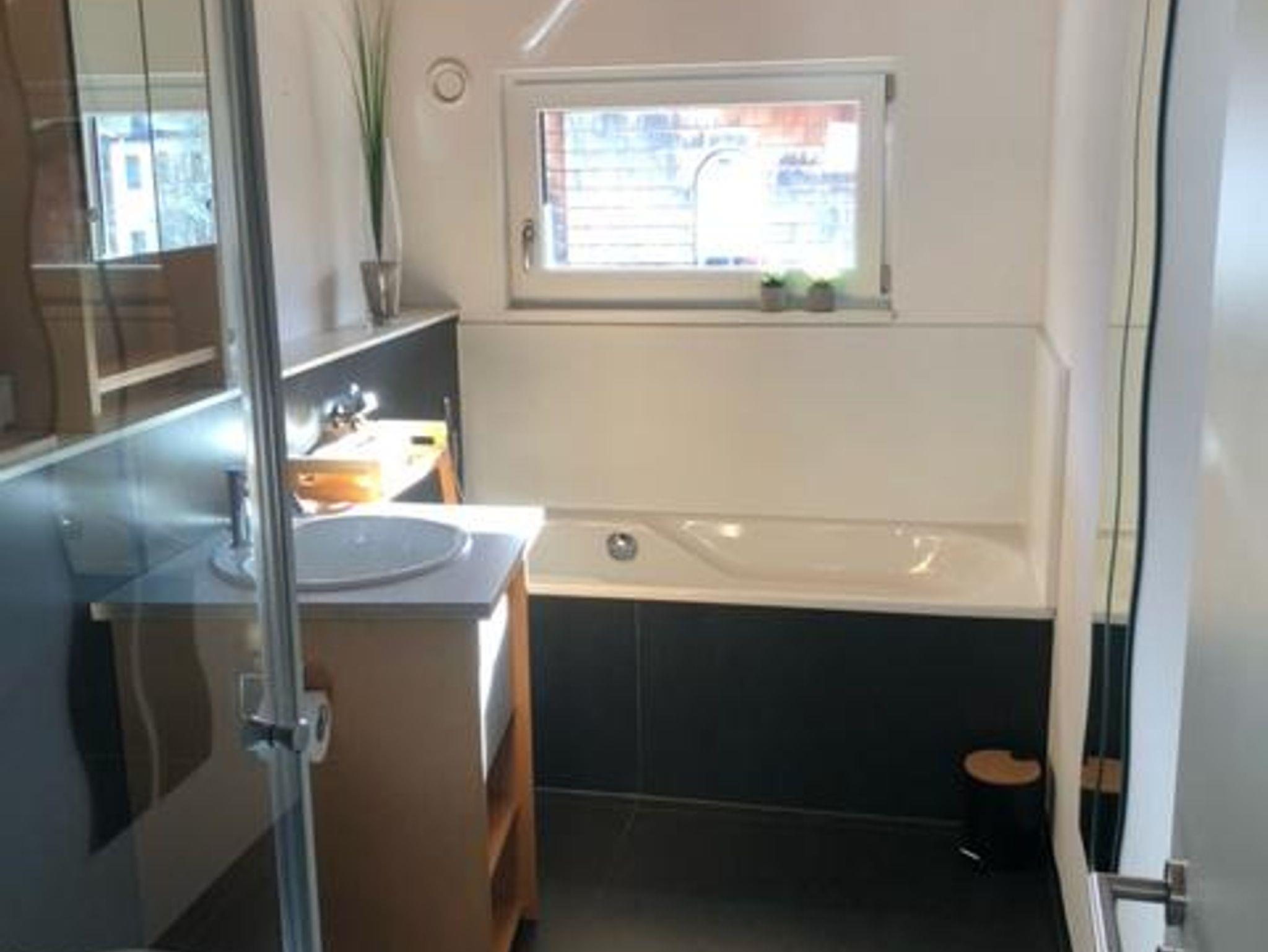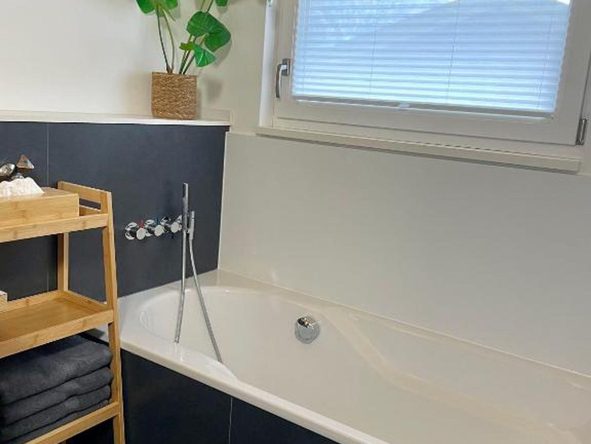 Das separate Bad mit Dusche, Badewanne und WC liegt zwischen den beiden Schlafzimmern.