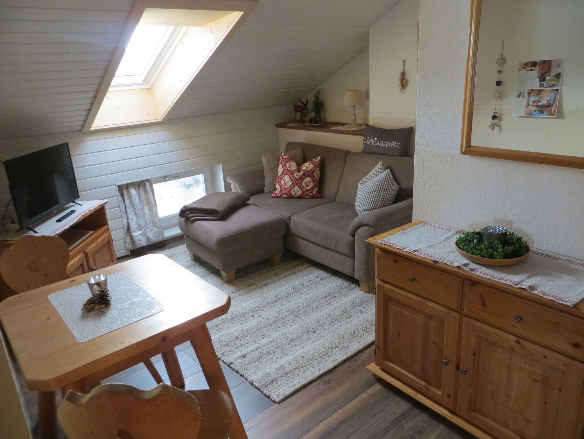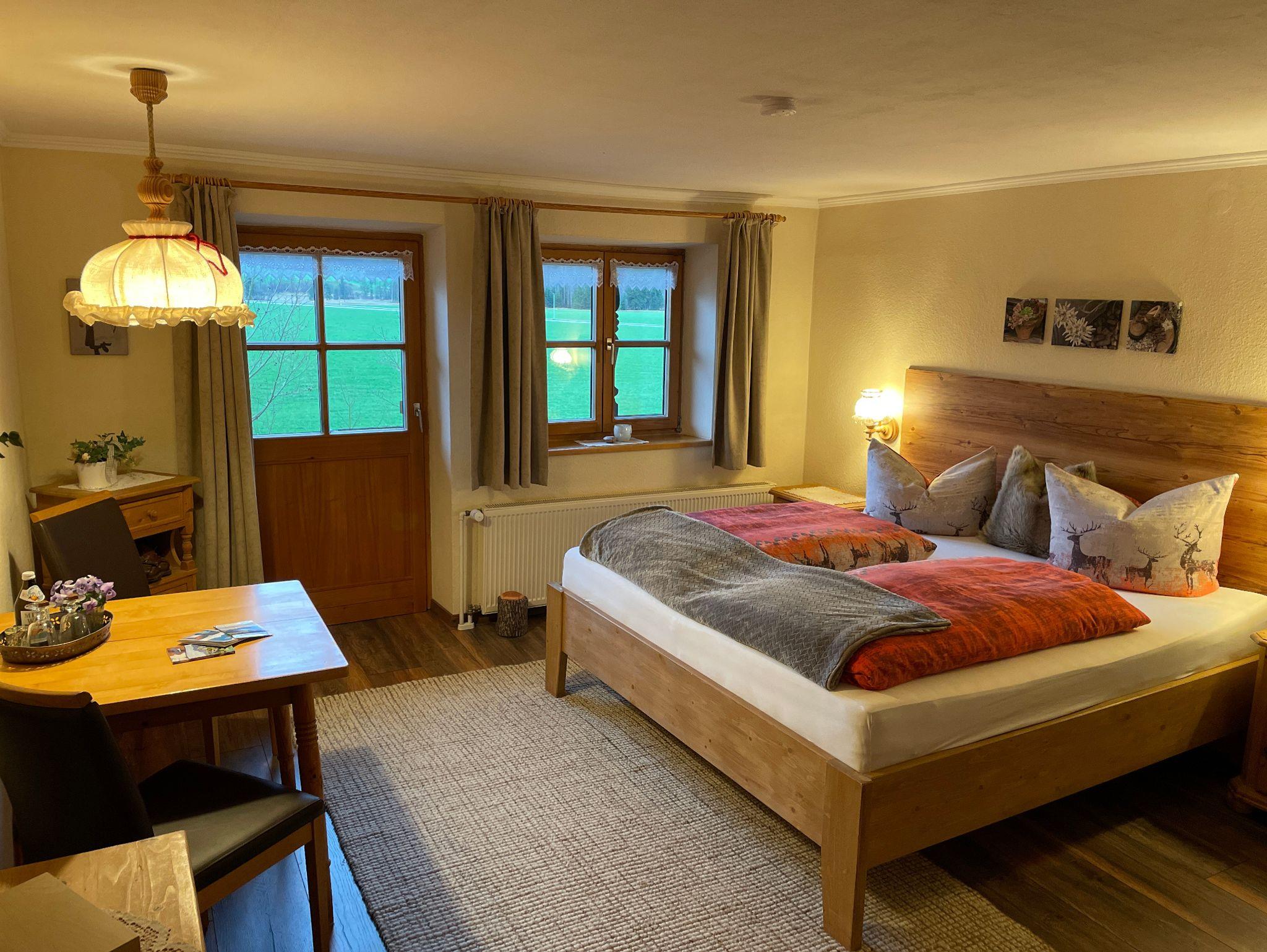 Zimmer im gemütlichen Landhausstil. Großzügiges Wohnen (Wohn- und Schlafraum getrennt), begehbarer Kleiderschrank, großer Balkon mit unverbautem Bergblick, TV, bodenebene Dusche .