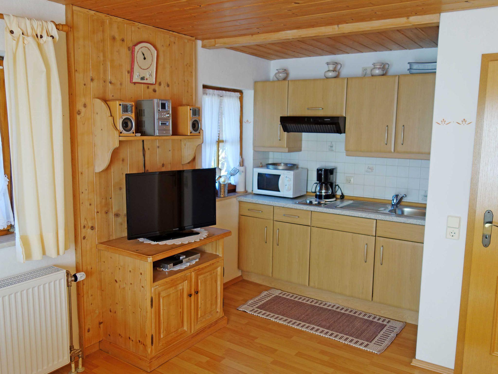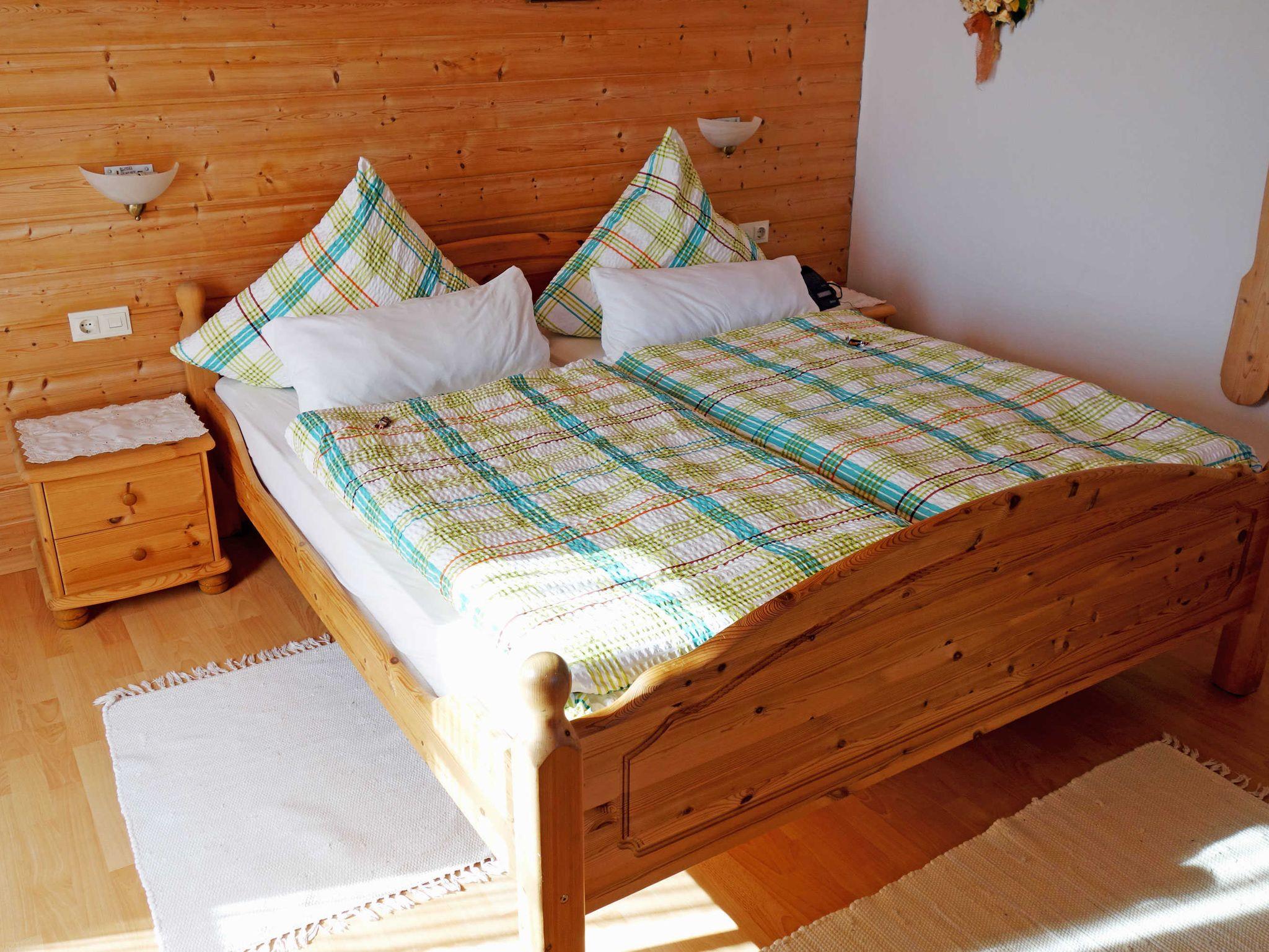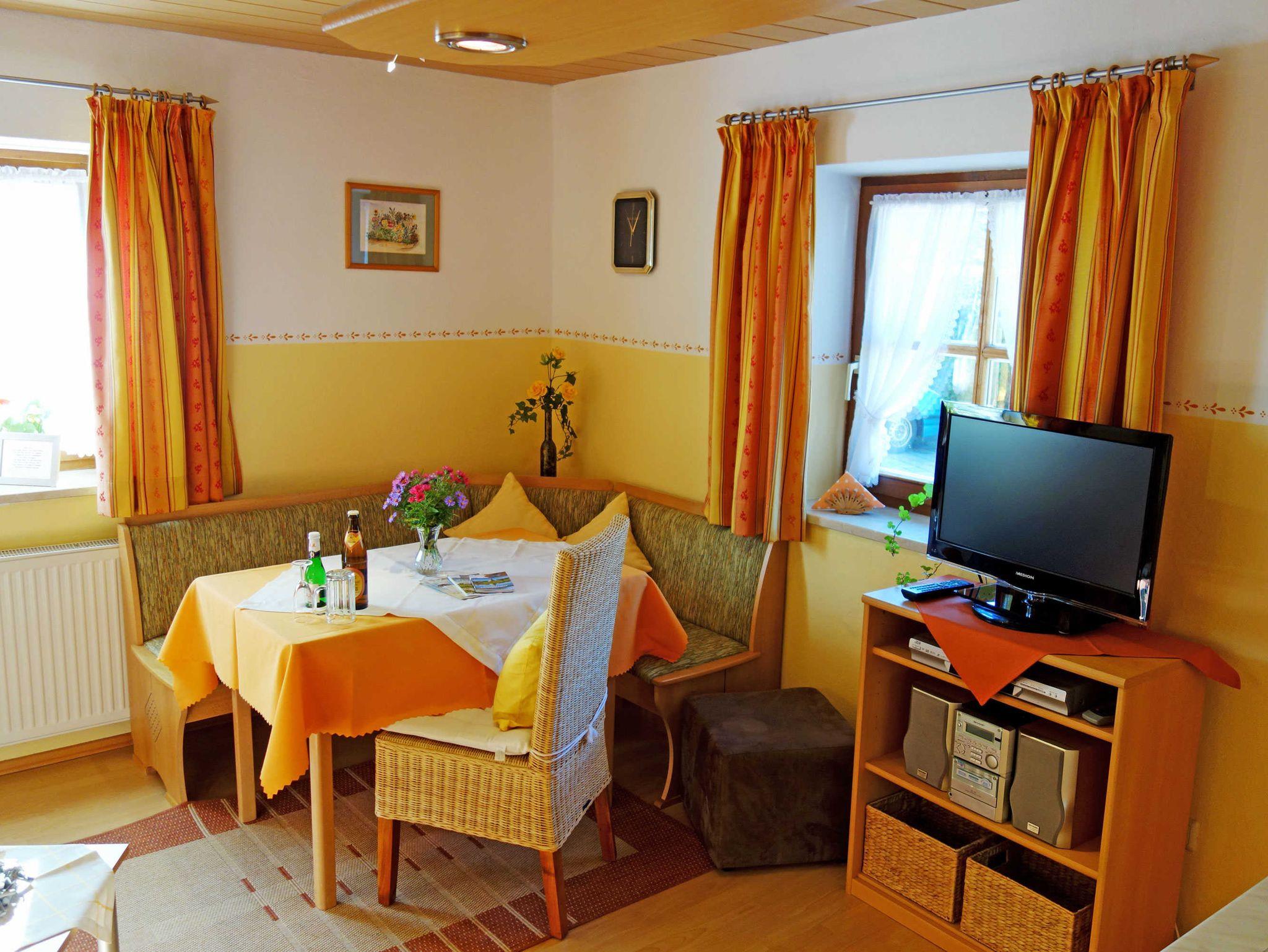 Unsere gemütlich und ländlich eingerichtete Ferienwohnung Falkenstein (40 qm, 2 Gäste) mit Terrasse Richtung Osten und herrlichem Bergpanorama bietet Ihnen ein im bäuerlichen Stil eingerichtetes Schlafzimmer mit Bad mit Dusche/WC und einen gemütlichen Wohnraum mit Essplatz, Couch und voll ausgestatteter Küchenzeile.