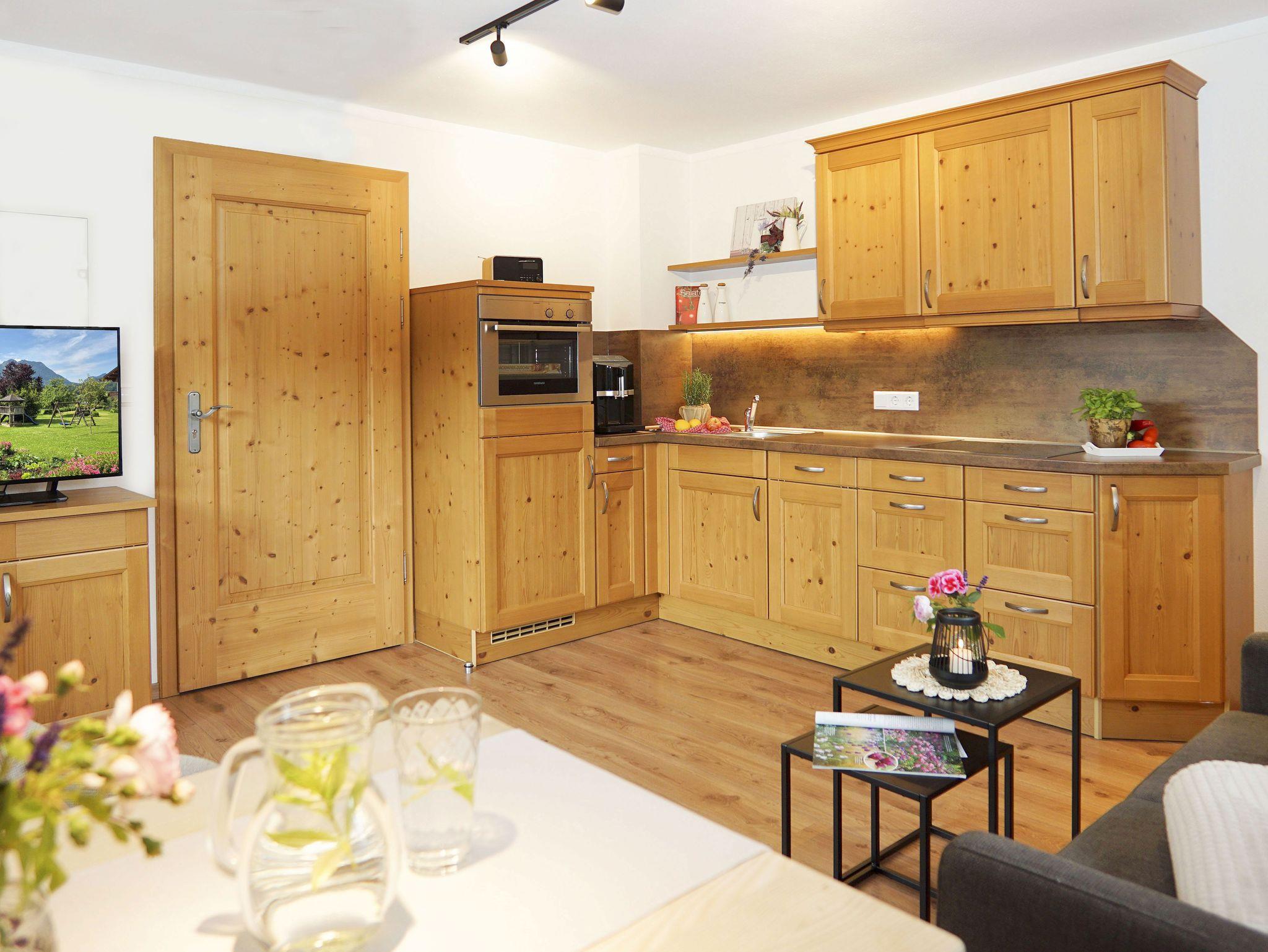 Neue, freundliche und exklusiv ausgestattete Ferienwohnung mit Balkon und Bergblick. Großzügige Wohnküche mit Couch, Essecke, Flachbildschirm-Sat-TV, Radio, DVD (Blue-ray) Echtholzküche mit Kaffeevollautomat, Geschirrspüler, 4-Platten-Ceranherd, Backofen, Dunstabzug, Kühlschrank mit Gefrierfach, Wasserkocher, Eierkocher, Toaster, Töpfe, Pfanne, Tablett, Badezimmer mit Dusche, Föhn, Kosmetikspiegel, großflächiger Handtuchtrockner, Kosmetiktücher, Seifenspender, Schlafzimmer mit Doppelbett, Kleiderschrank und Tresor für ihre Wertsachen, Balkon mit Sitzgarnitur, Betten sind frisch bezogen, Handtücher, Tischwäsche und Geschirrtücher sowie Küchen- und Toilettenpapier werden für Sie vorbereitet. Kostenloses WLAN im ganzen Haus. Sonstiges: Rauchmelder, Verbandskasten, Reinigungsutensilien, Wäscheständer. Gästemappe mit vielen weiteren Informationen