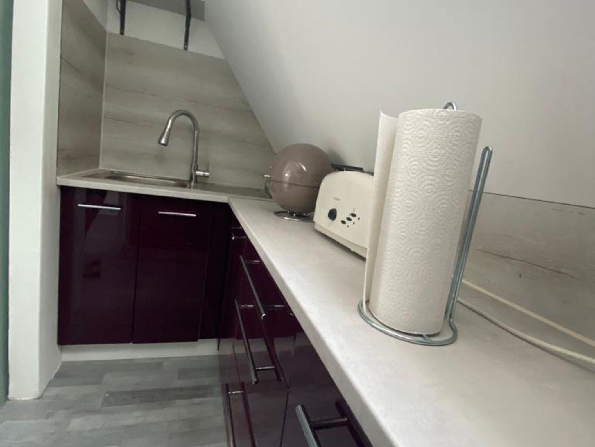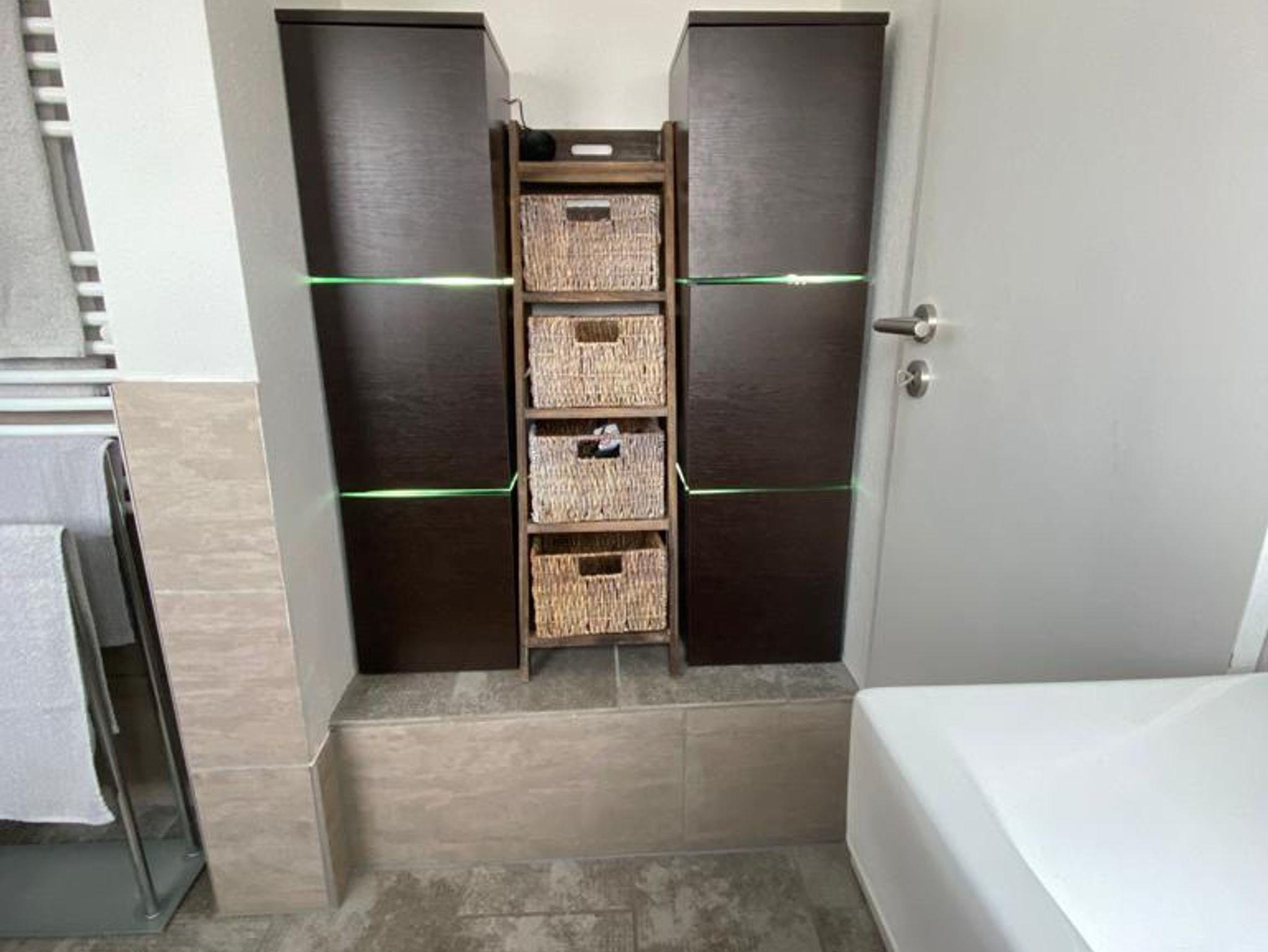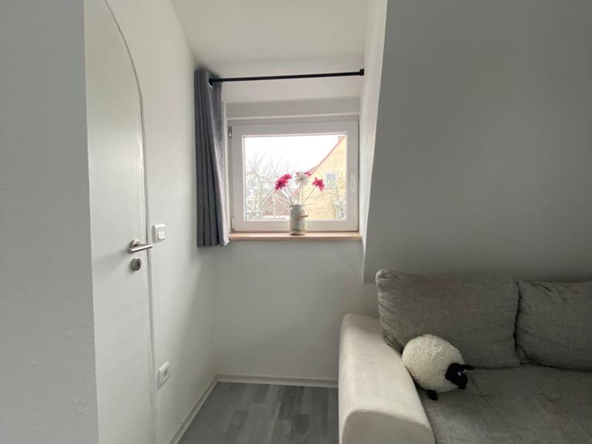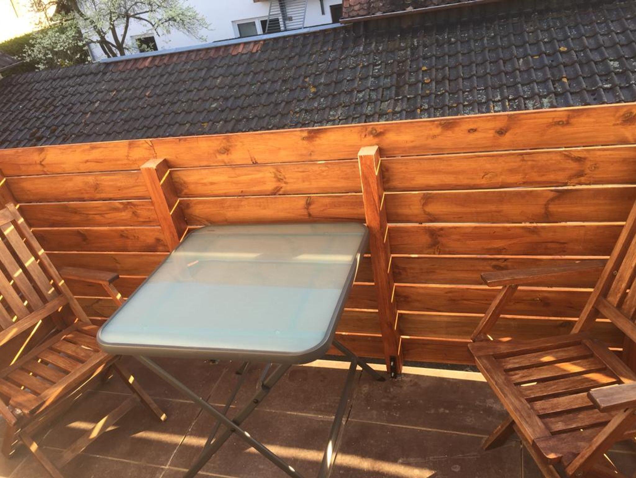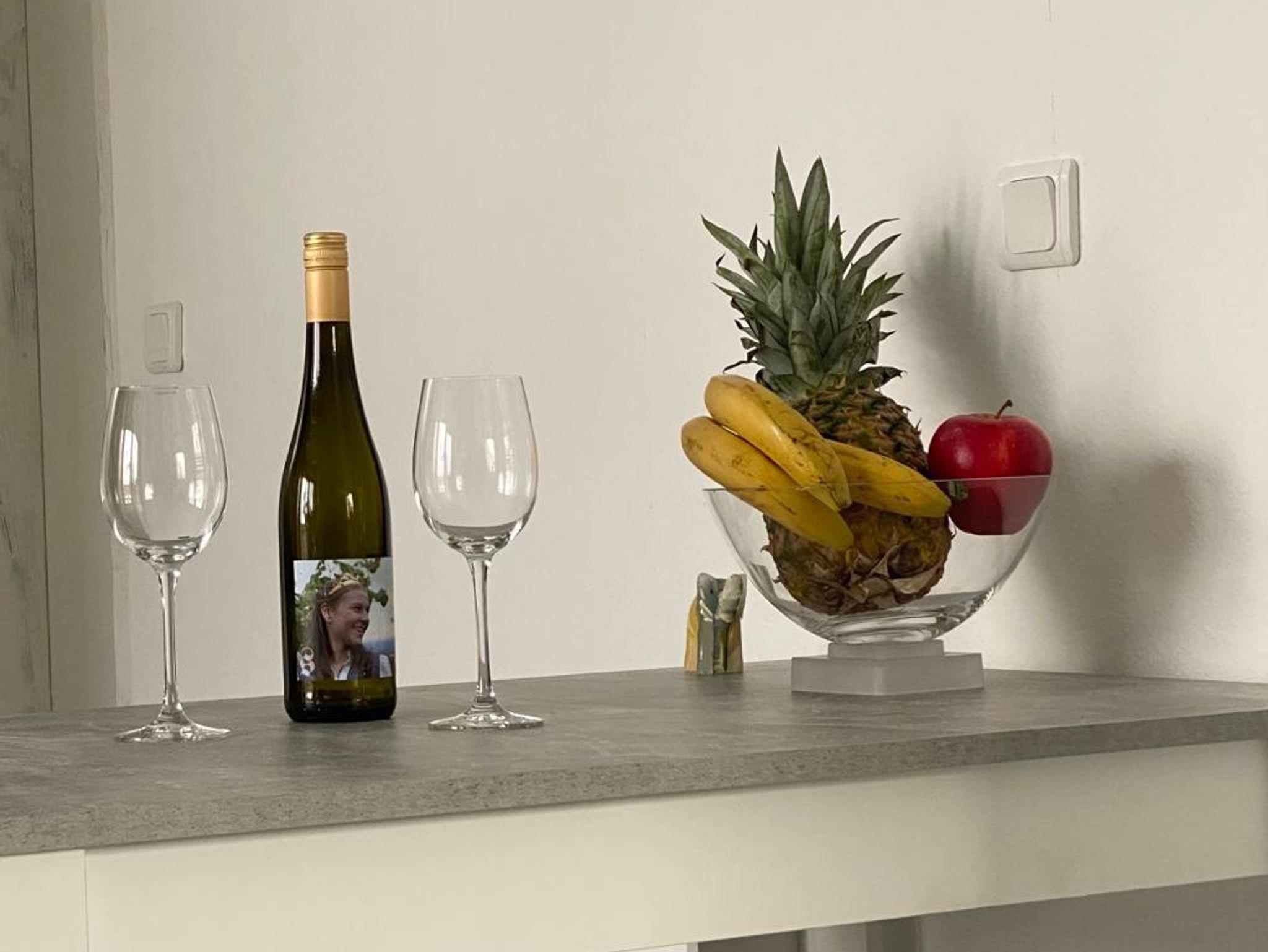 Diese helle Ferienwohnung im Obergeschoss des Hauses besteht aus einem Schlafzimmer mit einem Futonbett (160x200 cm) sowie einem Schiebeschrank, Sideboard und einem Fernseher. Das Badezimmer mit begehbare Regendusche lädt zum Entspannen ein. Der sonnendurchflutete Wohn- / Essbereich mit bequemer, ausziehbarer Schlafcouch sorgt für eine heimelige Atmosphäre. Die dem Wohnbereich angrenzende voll ausgestattete Küche verfügt über einen Herd, Ofen, Kühlschrank und ein Spülbecken, sowie Kaffeemaschine, Toaster und Dunstabzug. Der kleine an den Wohnbereich angrenzende Balkon lädt am Abend zu gemütlichem Verweilen ein. Genießen Sie bei einem lauschigen Sonnenuntergang den guten Wein.