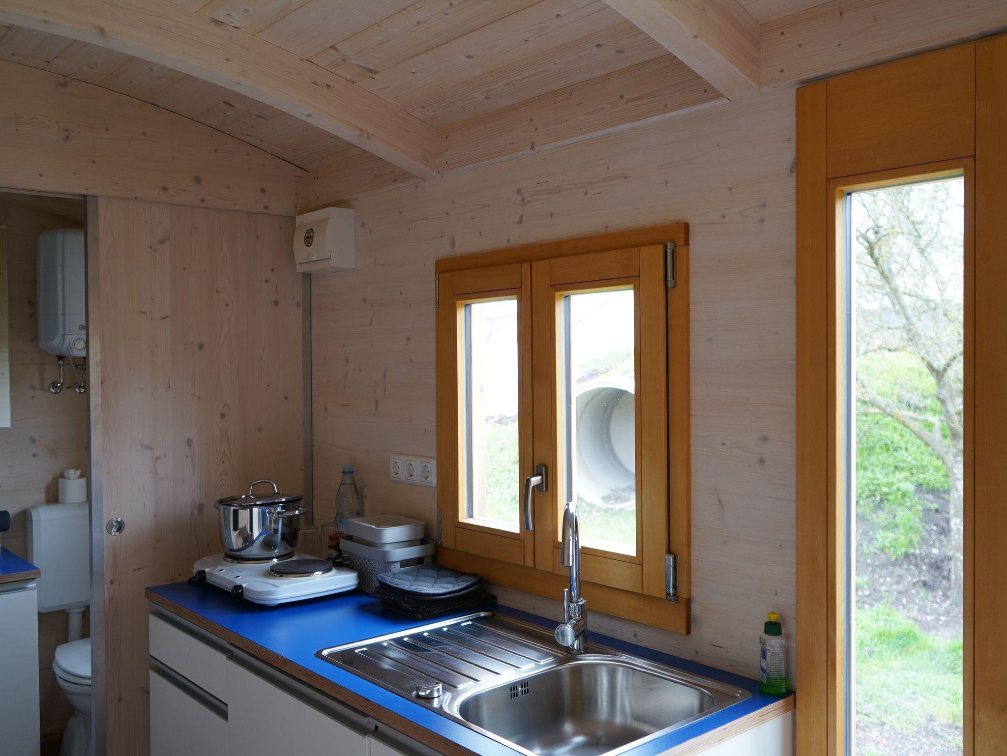 Dieses Tiny House steht idyllisch im Garten, umgeben von blühenden Obstbäumen. Starten Sie den Tag mit einem Frühstück im Grünen, begleitet vom fröhlichen Zwitschern der Vögel. Abends können Sie den Tag bei einem Glas erlesenen Frankenweins und regionalen Spezialitäten von unserem Schafhof gemütlich ausklingen lassen. Das kompakte Haus bietet Platz 2 Personen. Ein Bad mit Dusche, WC und Handwaschbecken sorgt für Komfort. Die praktische Küchenzeile ist ausgestattet mit zwei Herdplatten, kleinem Kühlschrank, Spülbecken, Kaffeemaschine, Wasserkocher und Toaster – ideal für die Zubereitung kleiner Mahlzeiten. Erleben Sie naturnahen Urlaub in einem liebevoll gestalteten Tiny House.