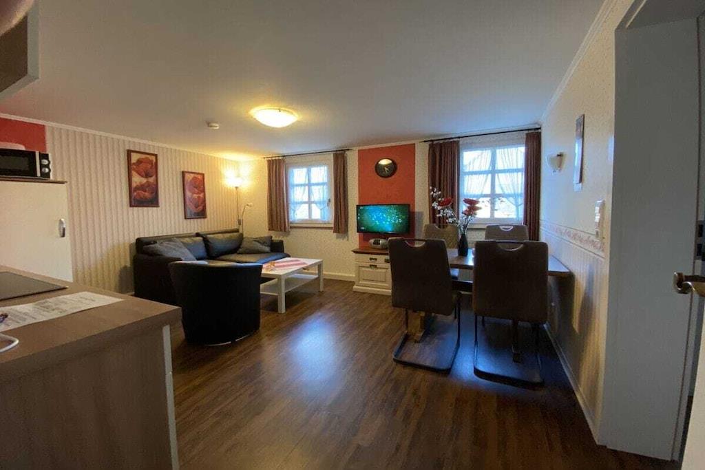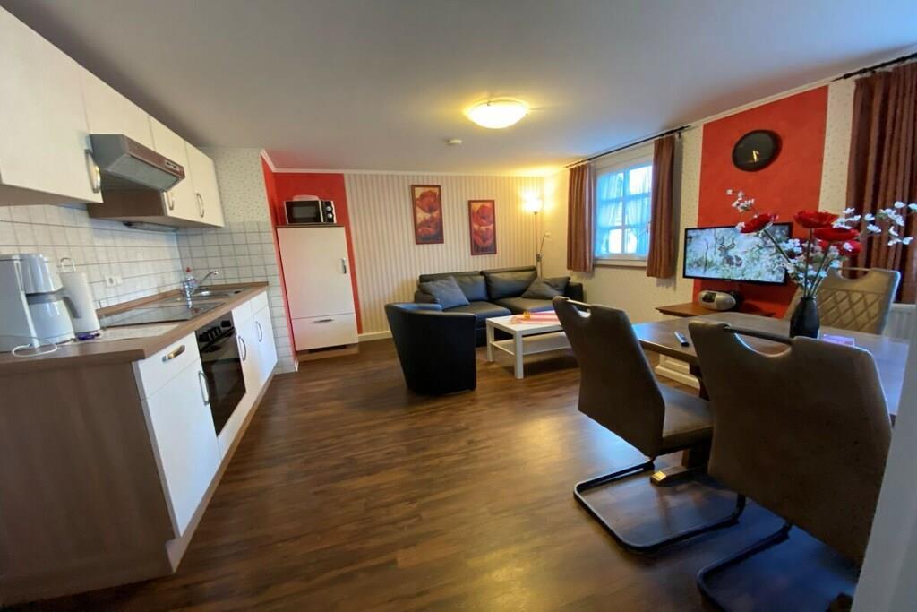 Unsere Ferienwohnung Mohnblume, für bis zu 3 Pers. wurde geschmackvoll in warmen Rot- Brauntönen eingerichtet. Die Ferienwohnung ist 35 m² groß und verfügt über einen Wohnraum mit Küche und Essecke sowie über ein großes Schlafzimmer mit einem Doppelbett (200x180) (3. Pers auf Schlafsofa im Wohnraum oder auf einem Zustellbett im Schlafzimmer)und ein Badezimmer mit einer Dusche. Der Wohnraum mit Küchenzeile (inkl. Mikrowelle, Toaster, Wasserkocher, Kühlschrank, Gefrierfach, E-Herd, Backofen) bietet Ihnen alles nötige für Ihren Aufenthalt. Sat-TV, WIFI Hotspot, Brötchenservice und Getränkeservice, inkl. Bettwäsche, Handtücher, Küchentücher runden unser Angebot ab.