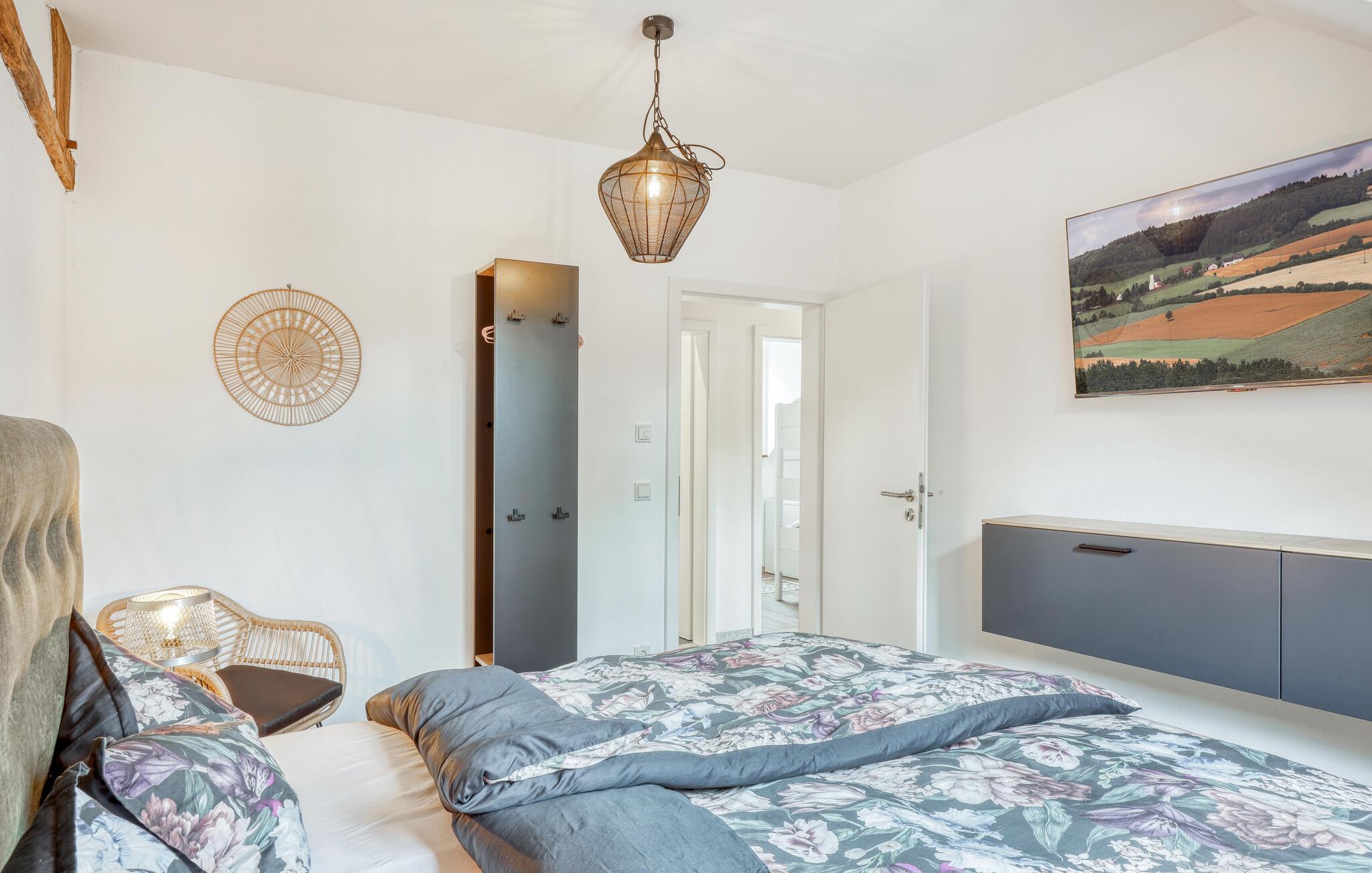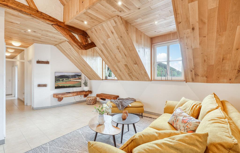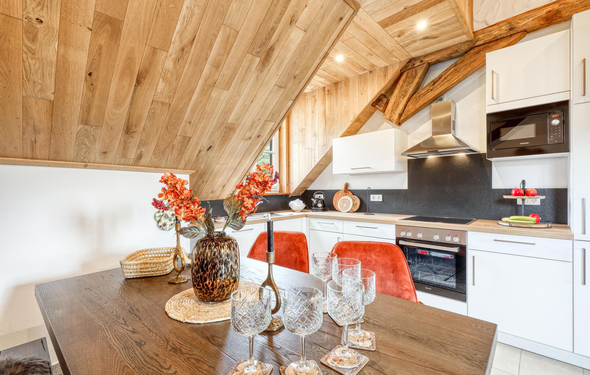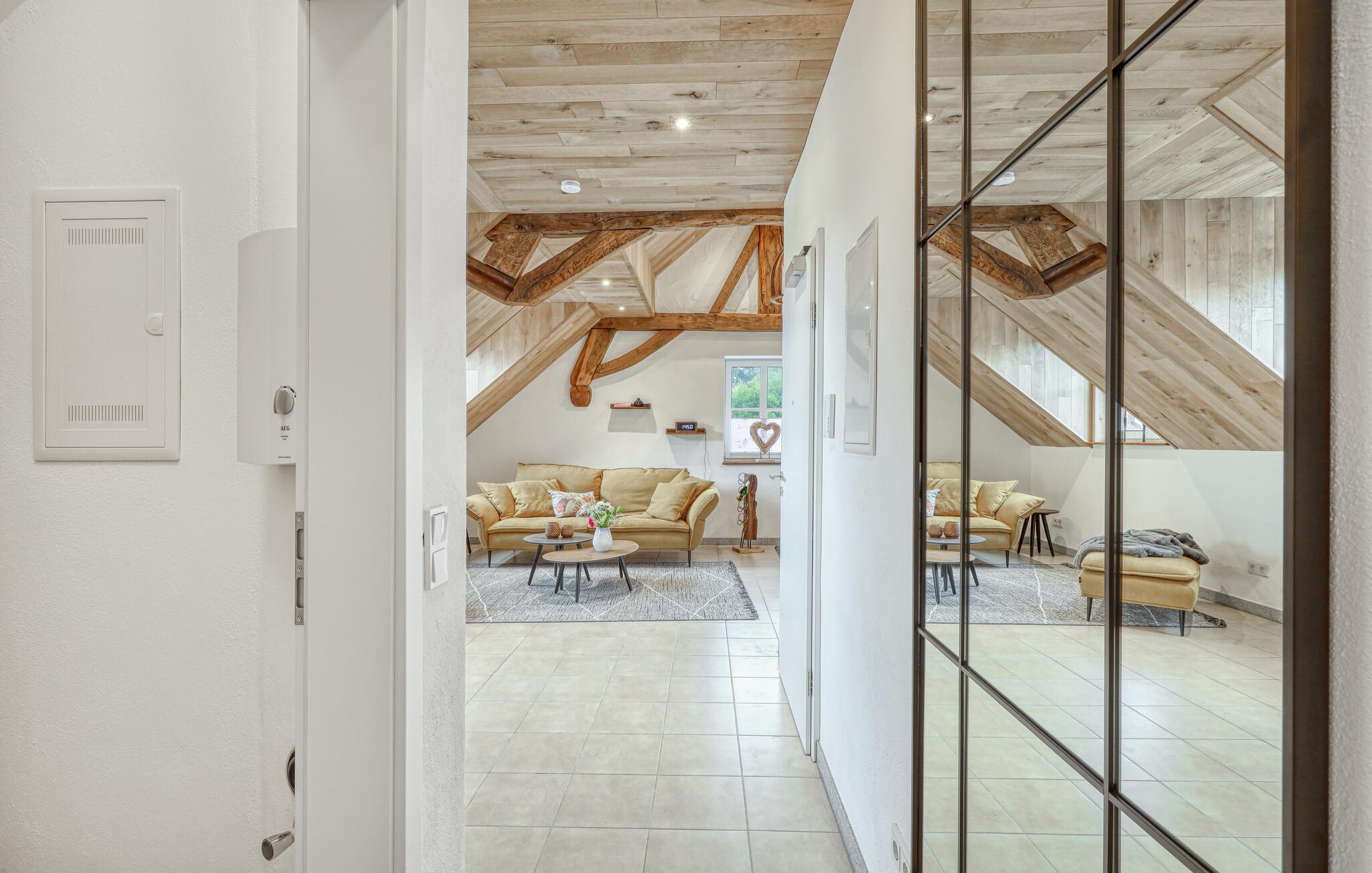 Fordyp deg i sjarmen til denne praktfulle ferieleiligheten med sitt imponerende tretak og takbjelker. I Irrhausen, midt i Eifel-landskapet, tilbyr dette overnattingsstedet komfort og stil. Det smakfullt innredede interiøret skaper en koselig atmosfære der du umiddelbart vil føle deg hjemme.