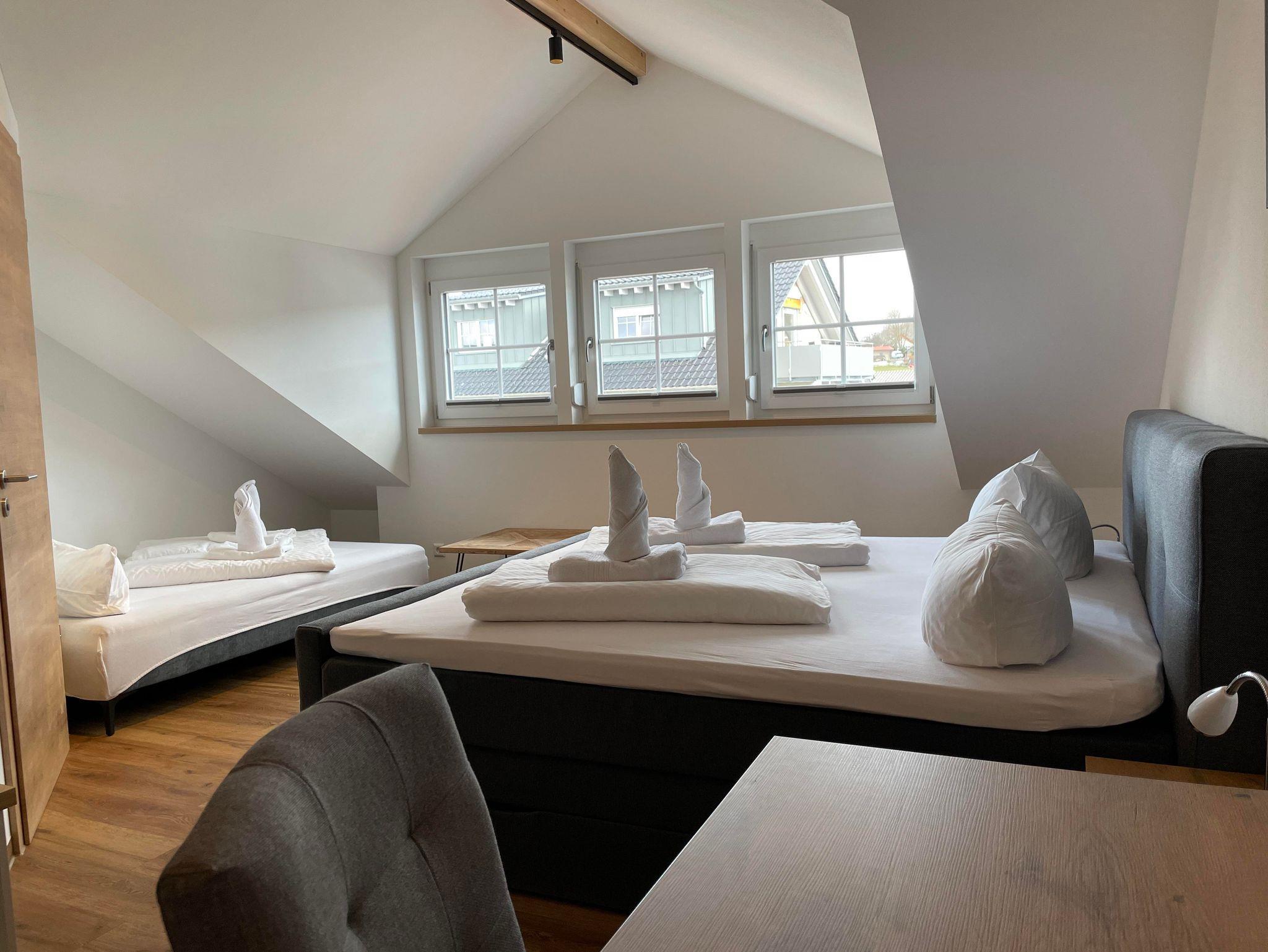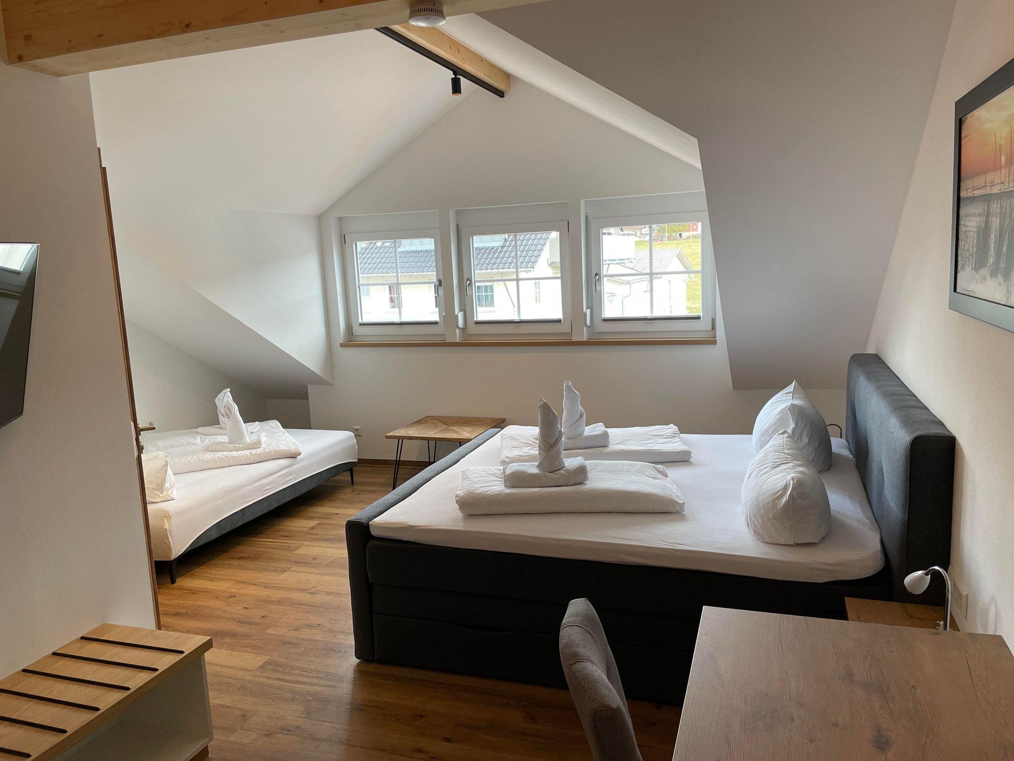 Modern und neu. Unser Superior Zimmer mit Boxspringbett, Schlafcouch, TV, Bad/WC mit begehbarer Dusche, Tisch, freies W-LAN