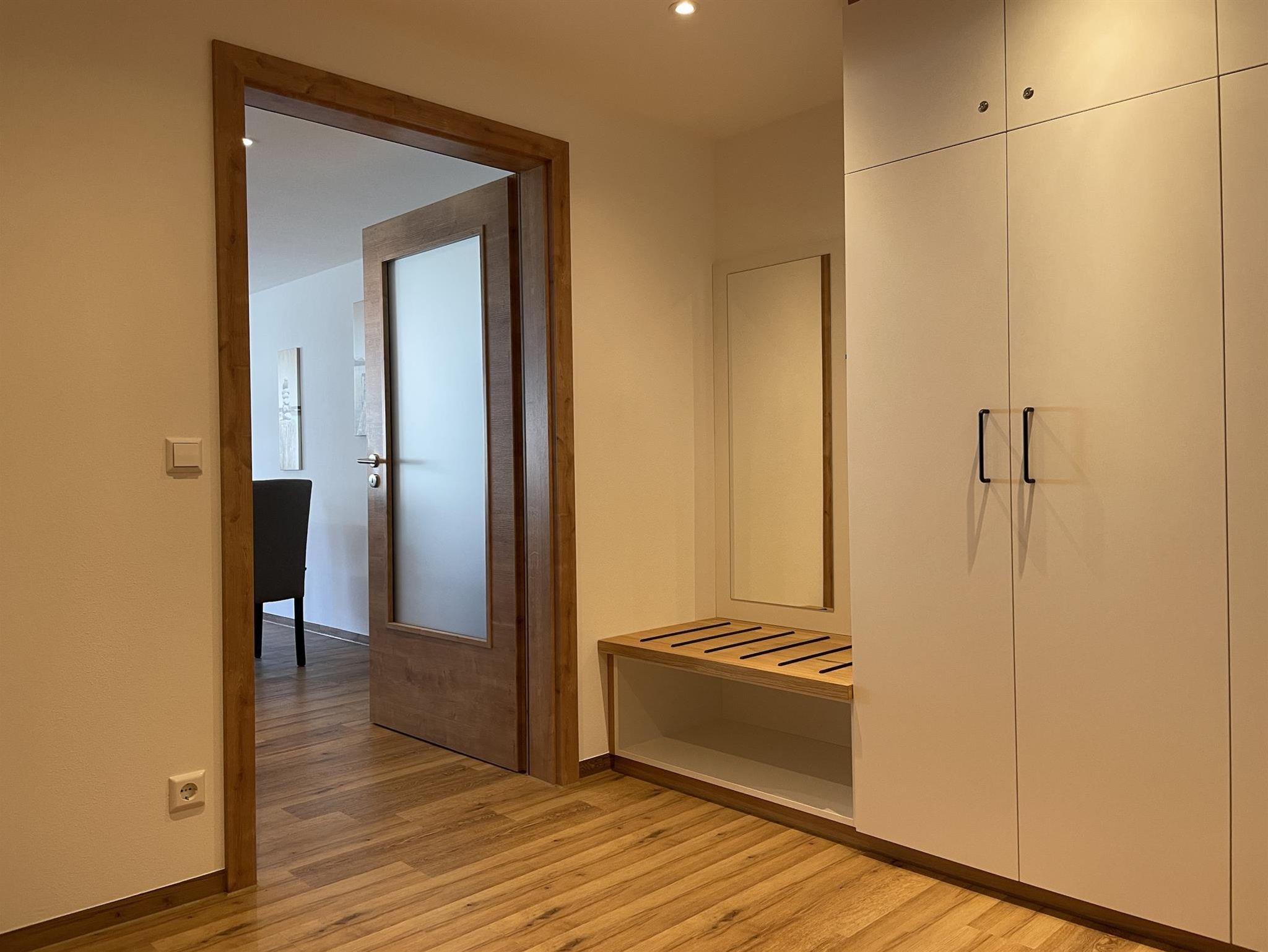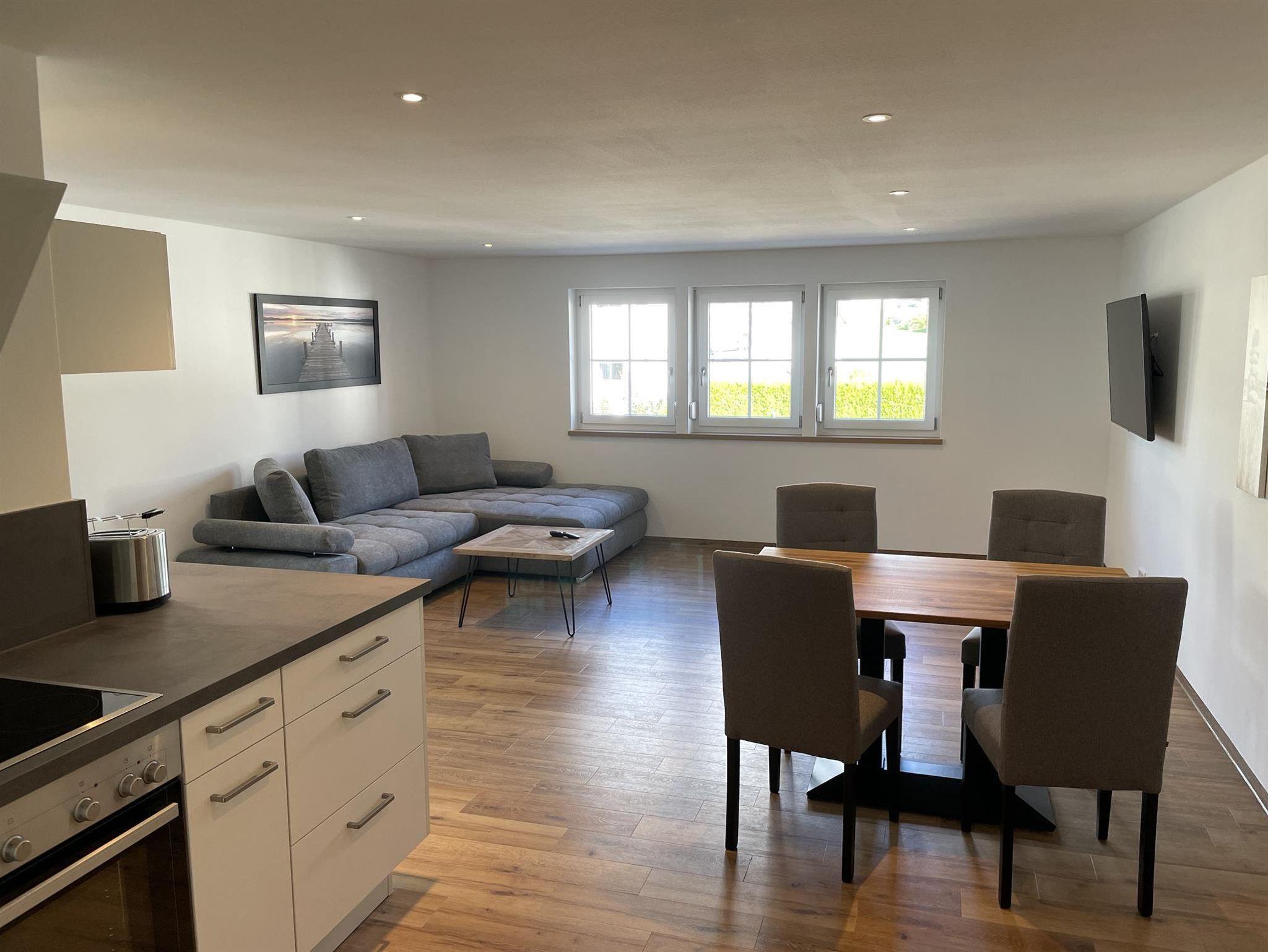 Unsere neue moderne Ferienwohnung 3 befindet sich im Haupthaus und vergfügt über 1 Schlafzimmer, einer Küche, einem Bad/WC mit begehbarer Dusche einem separaten Wohn-/Essbereich mit Schlafcouch.