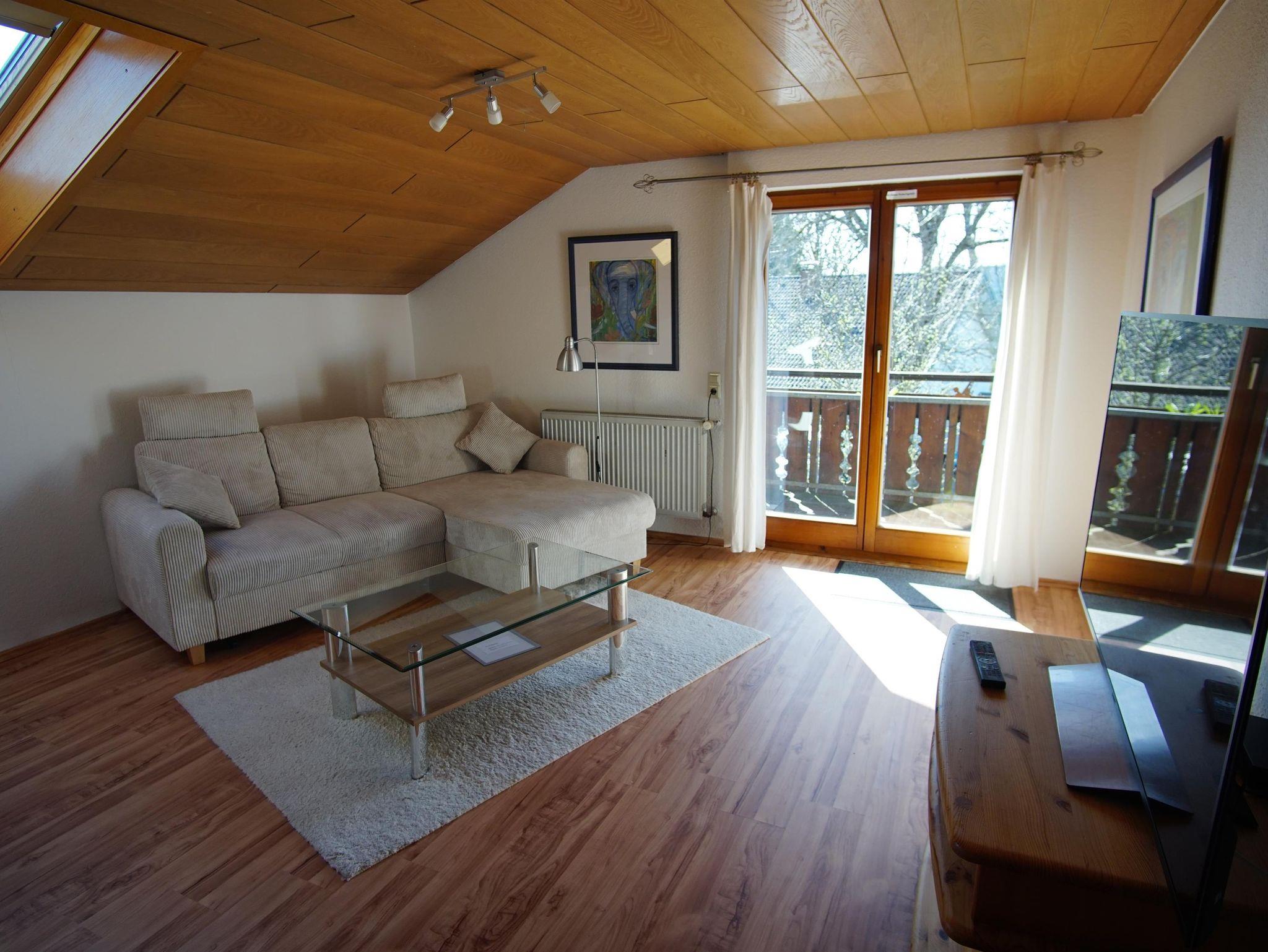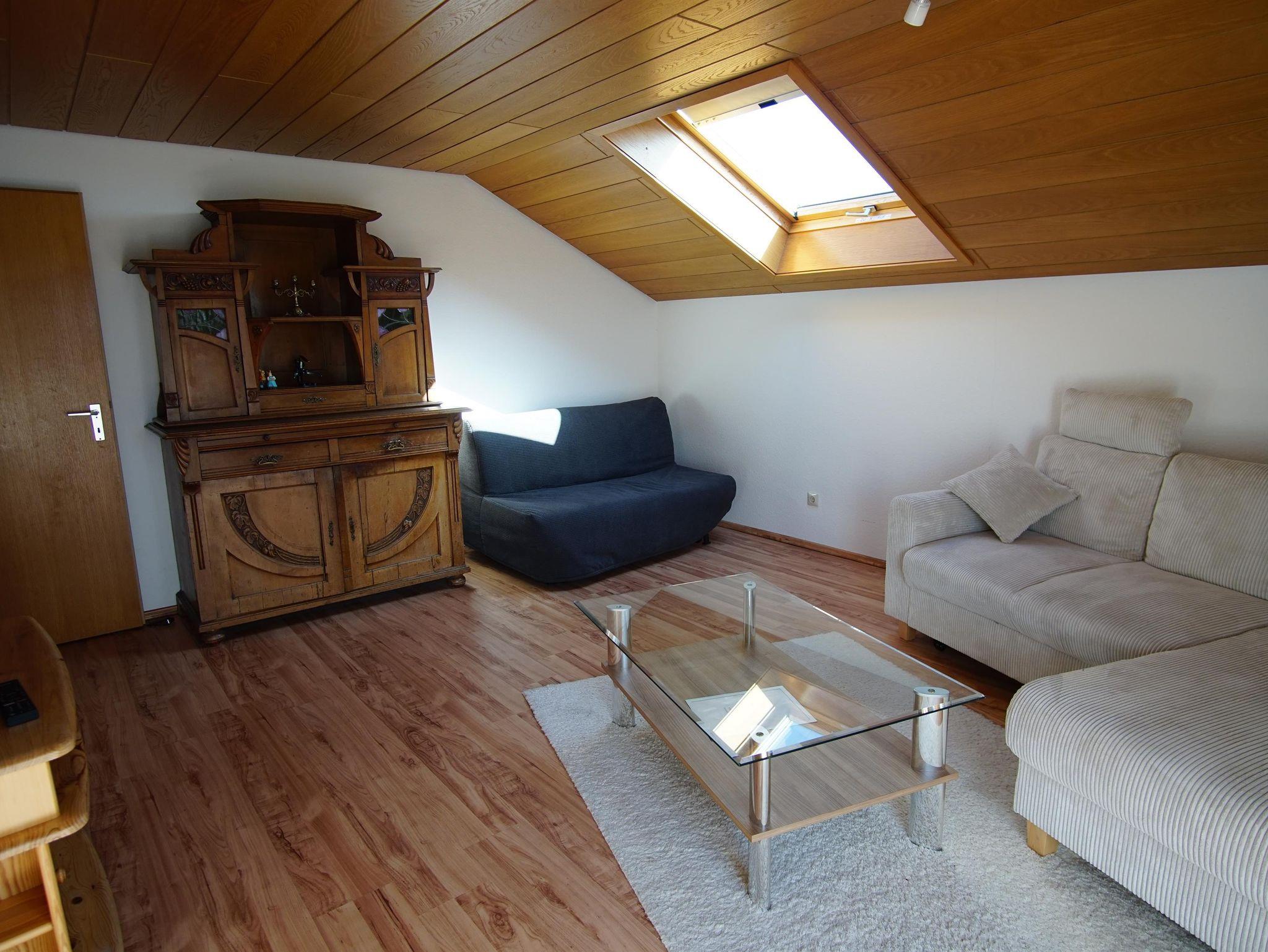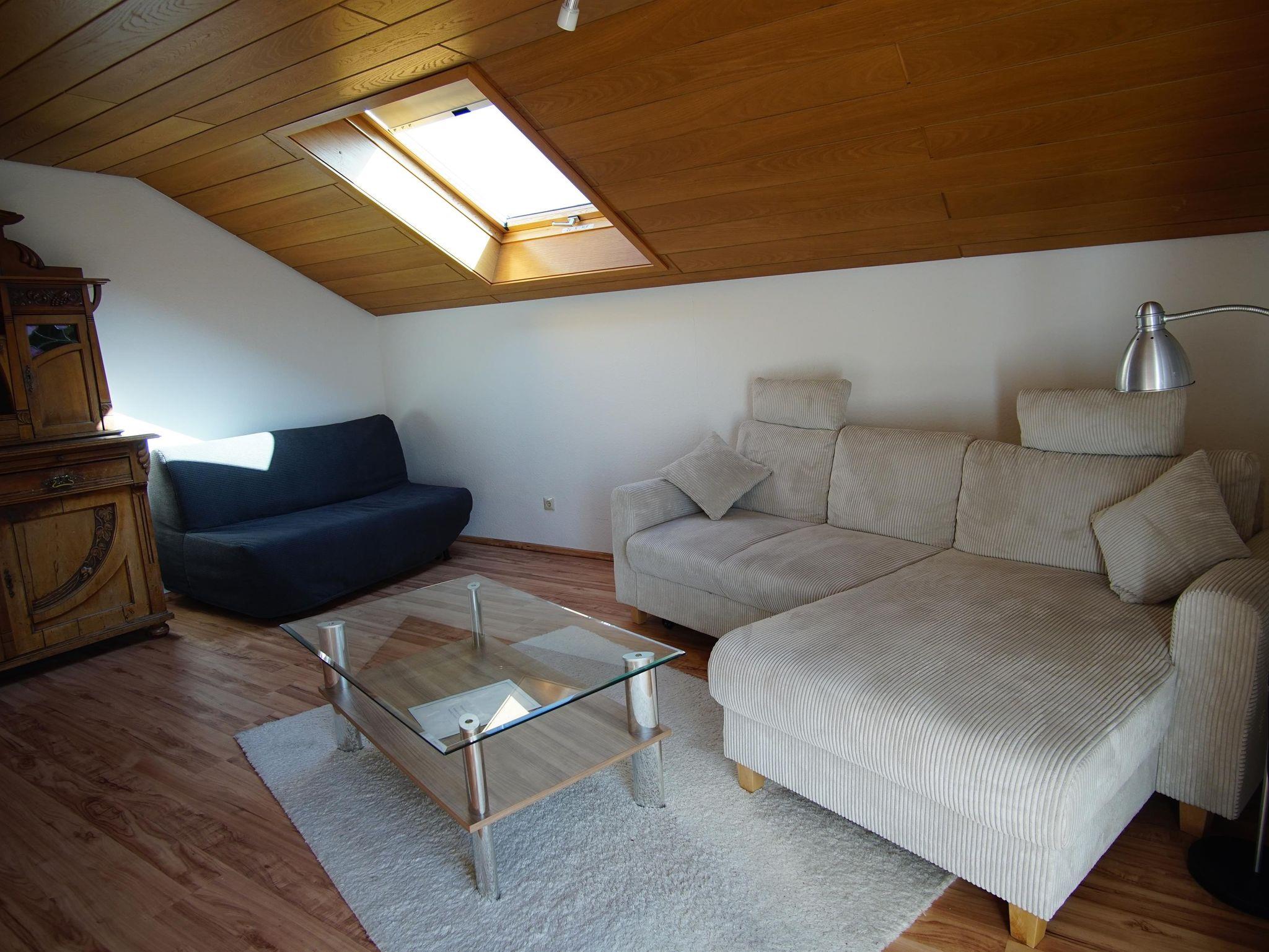 Dachwohnung mit großer Wohnküche, Spülmaschine, Wohnzimmer mit Sofabett, TV, Schlafzimmer mit Doppelbett, Badezimmer mit Dusche und WC, Sonnenbalkon, Zentralheizung.